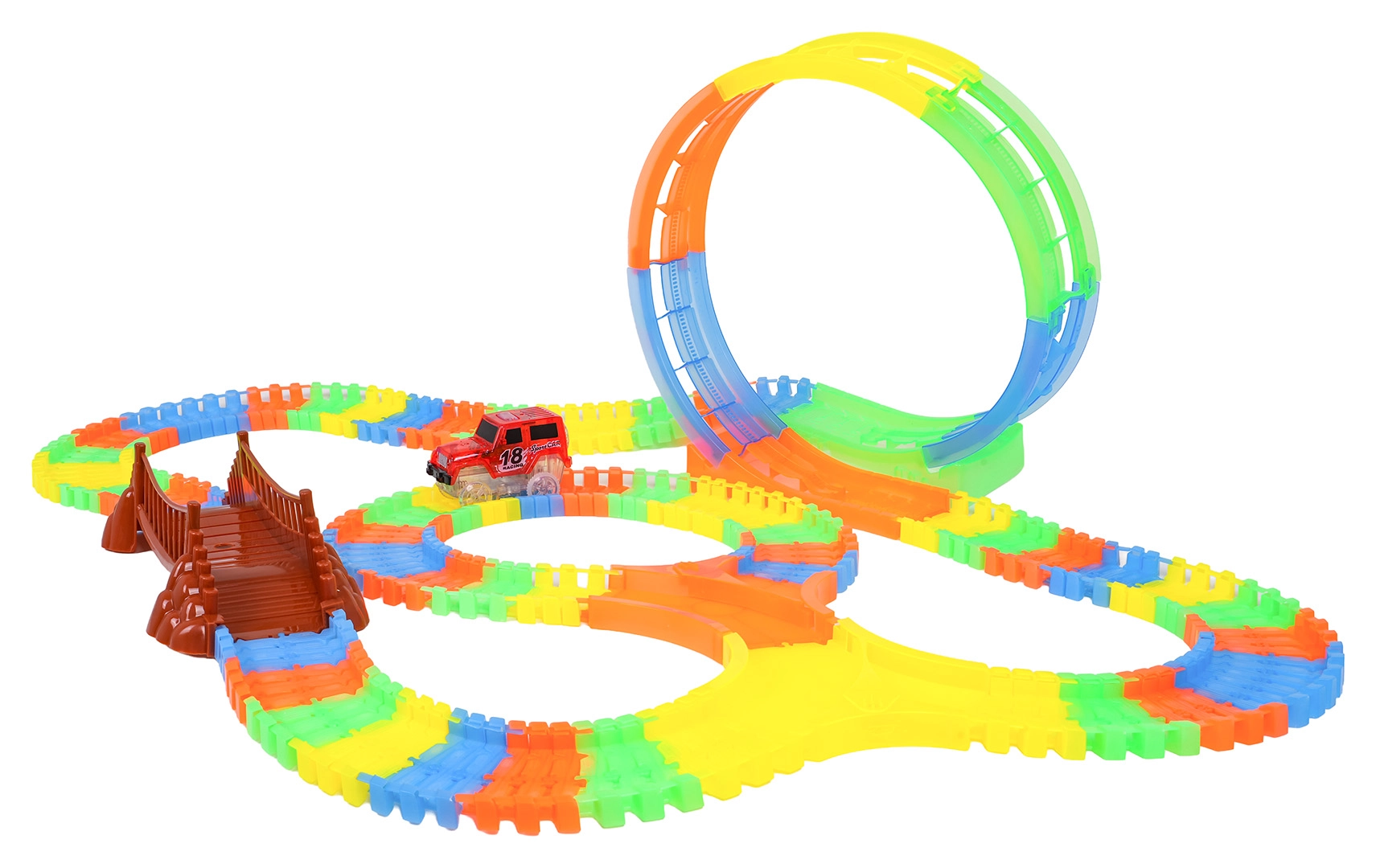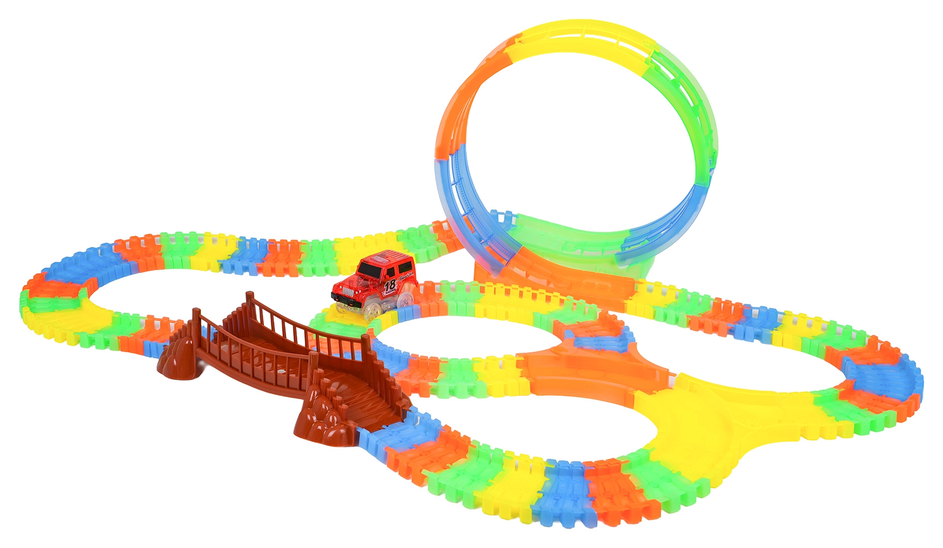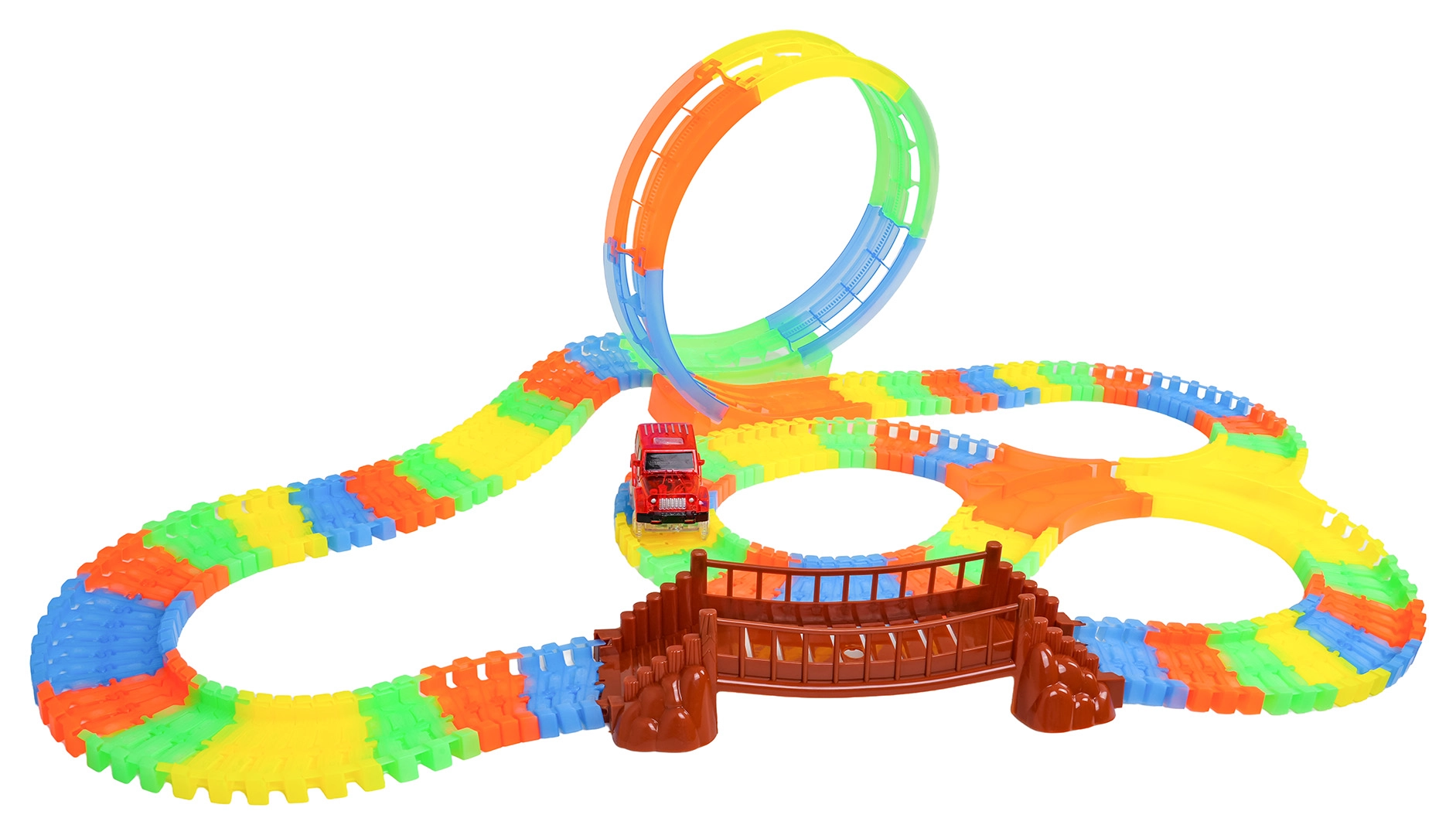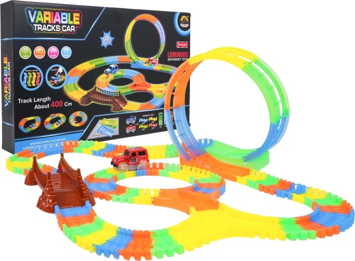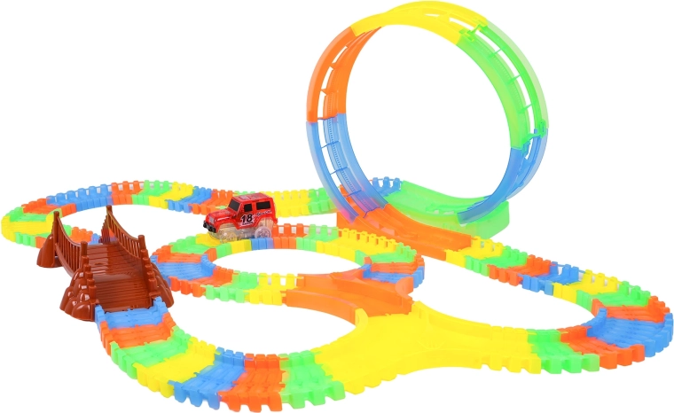 Deze kleurrijke racebaan is leuk voor kinderen vanaf 3 jaar. Dankzij de flexibele segmenten bouw je in een mum van tijd rechte stukken, bochten, een brug en een grote verticale lus. Het fluorescerende ontwerp zorgt voor een gloeieffect in het donker, terwijl het LED-autootje over de baan rijdt en een lichtspoor achterlaat.