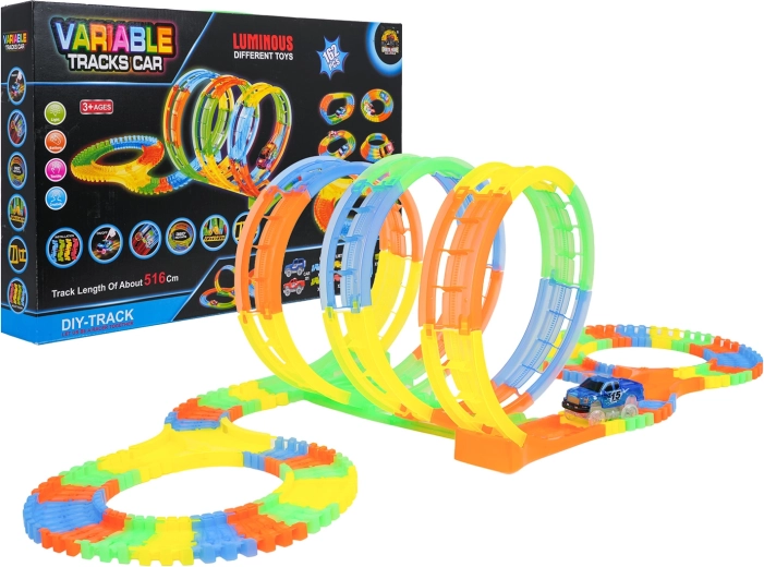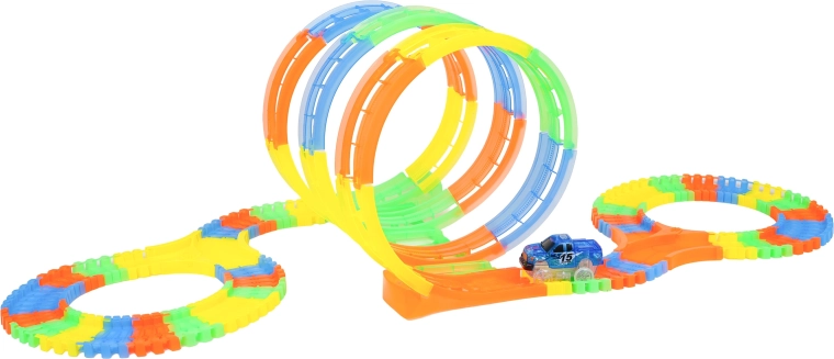 Deze kleurrijke racebaan biedt kinderen creatief bouwen en dynamisch rijden. Dankzij de elastische, klikbare delen ontstaan in een handomdraai loops, bochten en bruggen die op elk moment kunnen worden aangepast – zelfs tijdens het rijden. De fluorescerende uitvoering van de baan en de LED-verlichting van het autootje zorgen in het donker voor een schitterende lichtshow.