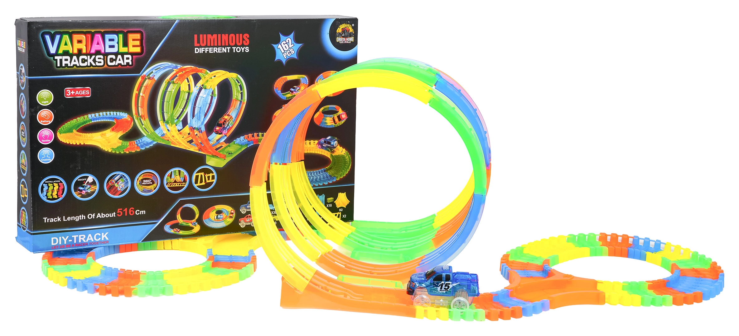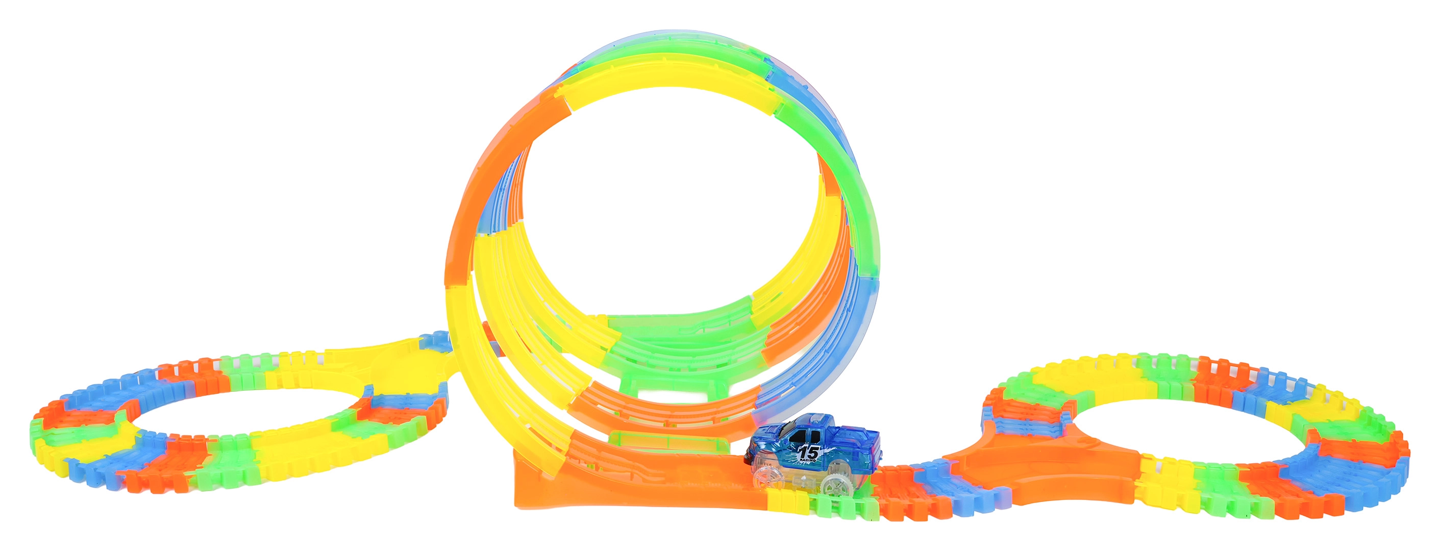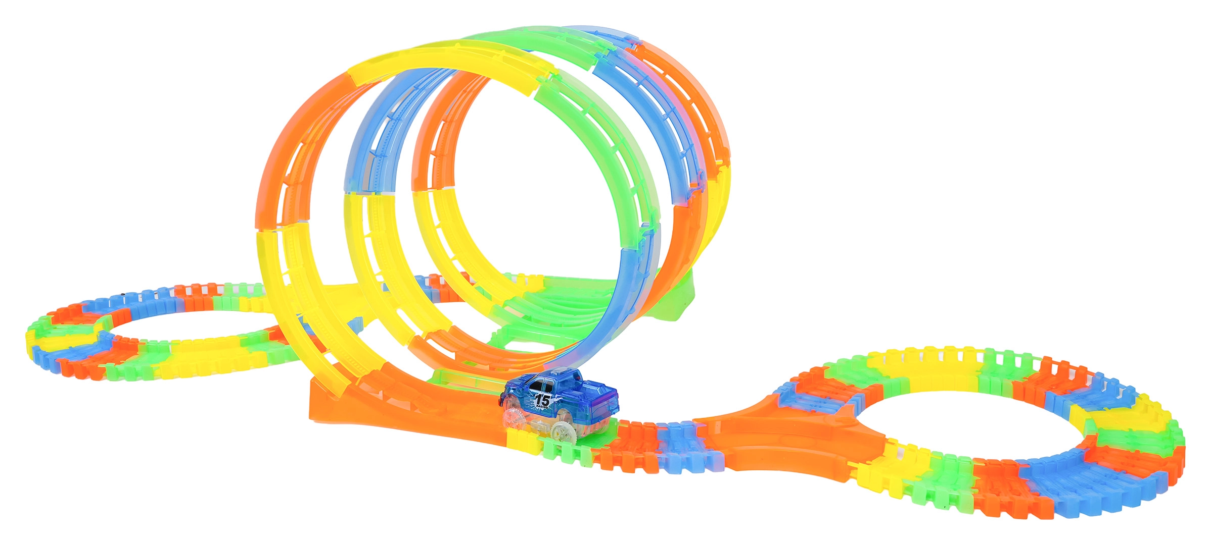 Bouw eindeloos speelplezier voor kinderen met de racebaan met 162 onderdelen, die flexibel is, licht in het donker en een LED-autootje bevat. De delen klikken eenvoudig in elkaar tot verschillende vormen en loops, zodat kleine racers vanaf 3 jaar hun eigen banen kunnen maken en kunnen genieten van stuntritten met een indrukwekkend lichteffect.