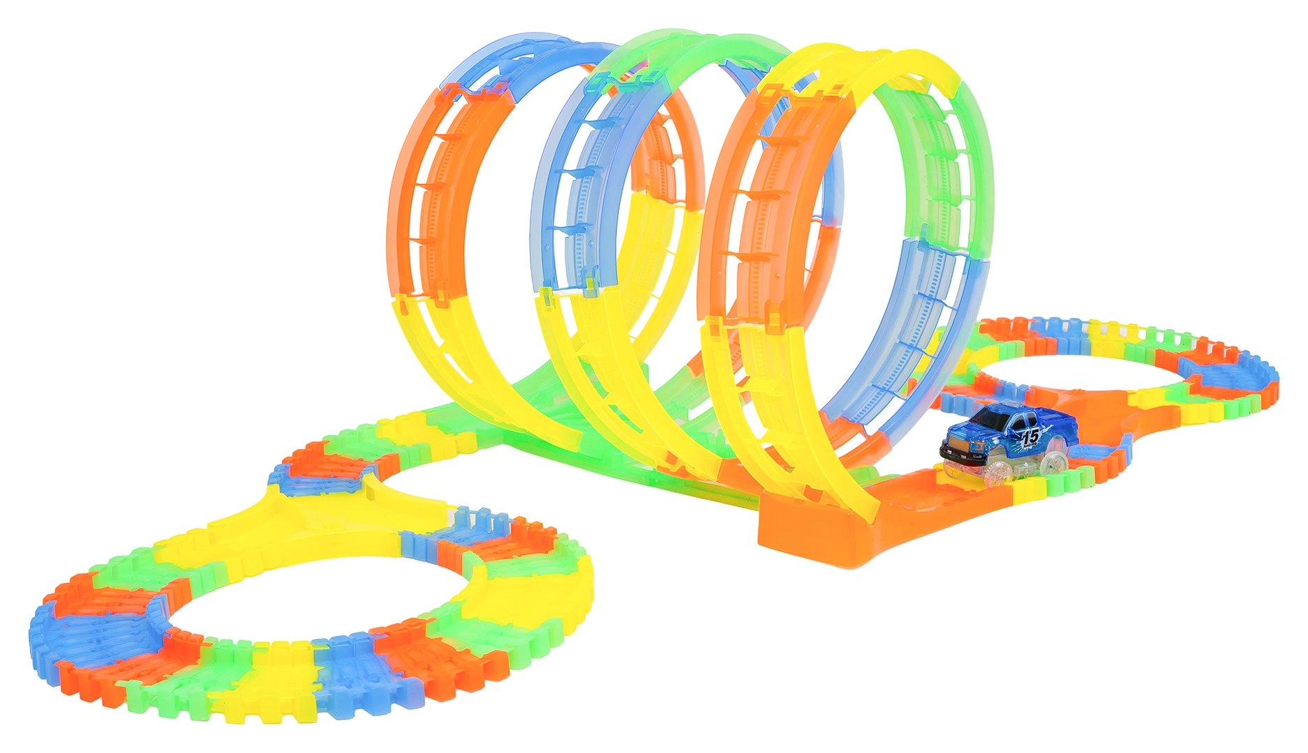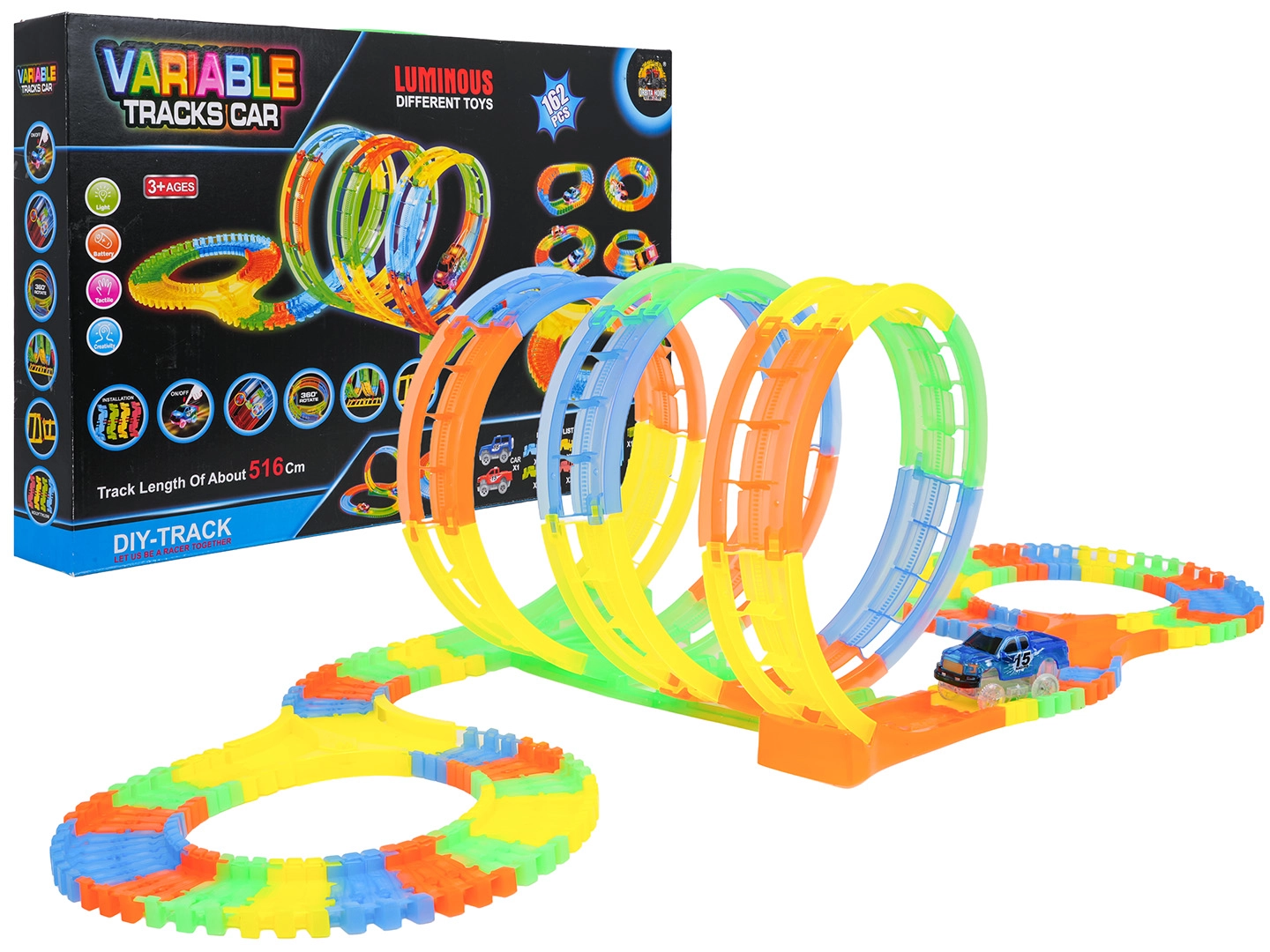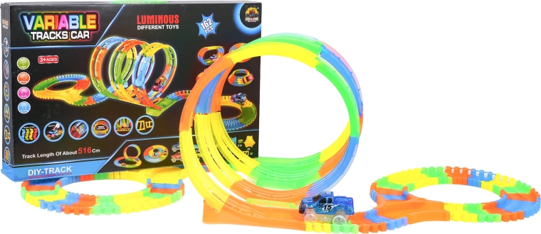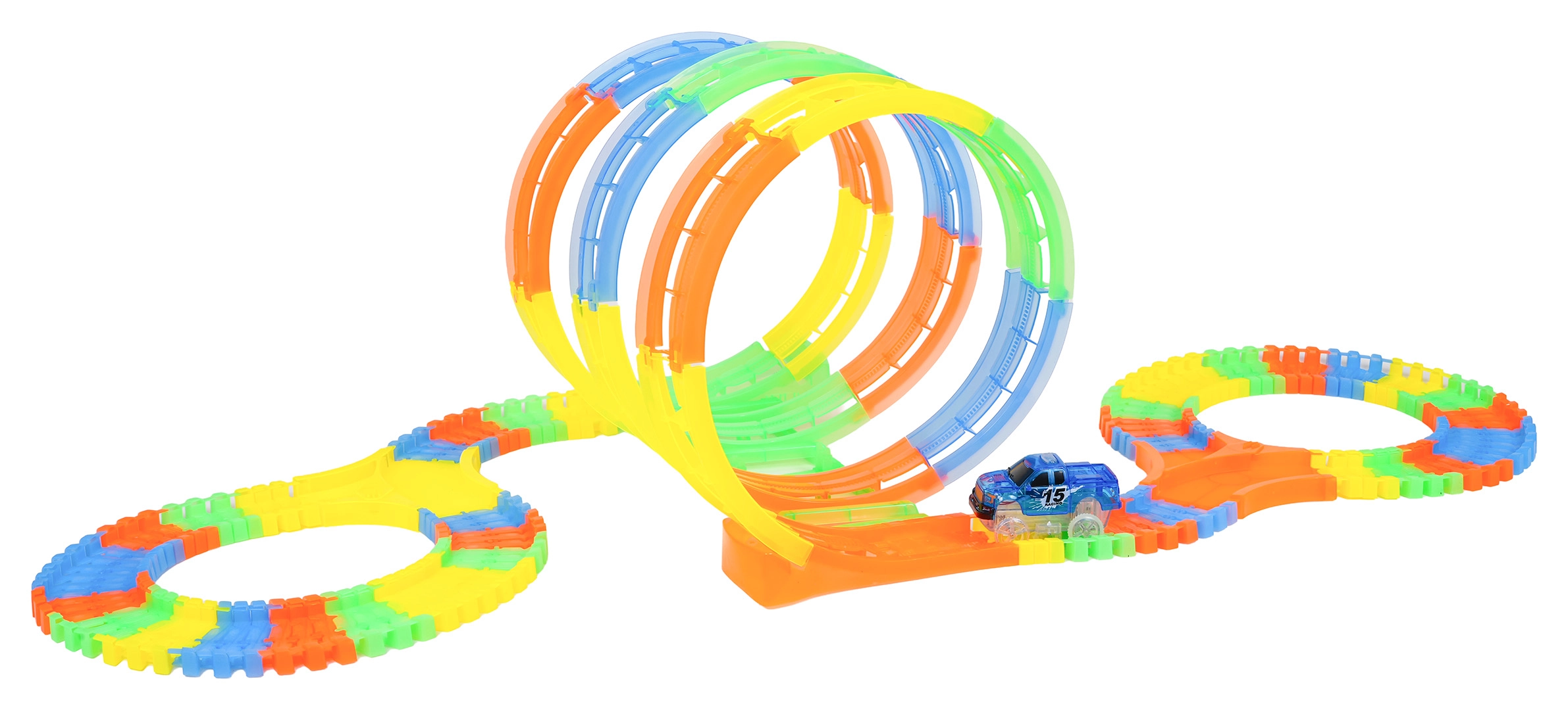 Bouw eindeloos speelplezier voor kinderen met de racebaan met 162 onderdelen, die flexibel is, licht in het donker en een LED-autootje bevat. De delen klikken eenvoudig in elkaar tot verschillende vormen en loops, zodat kleine racers vanaf 3 jaar hun eigen banen kunnen maken en kunnen genieten van stuntritten met een indrukwekkend lichteffect.