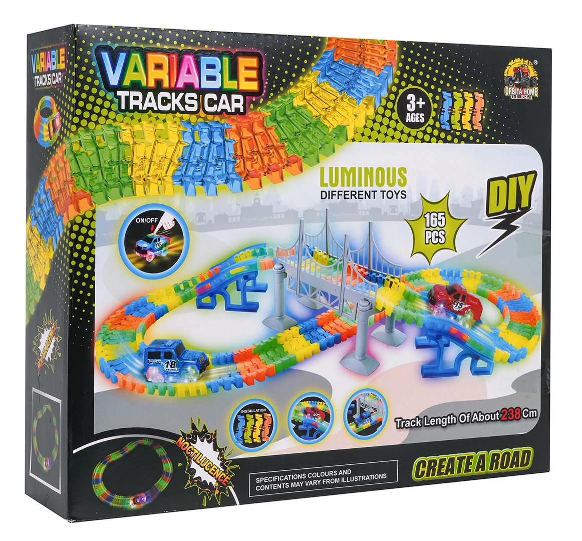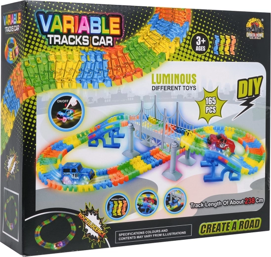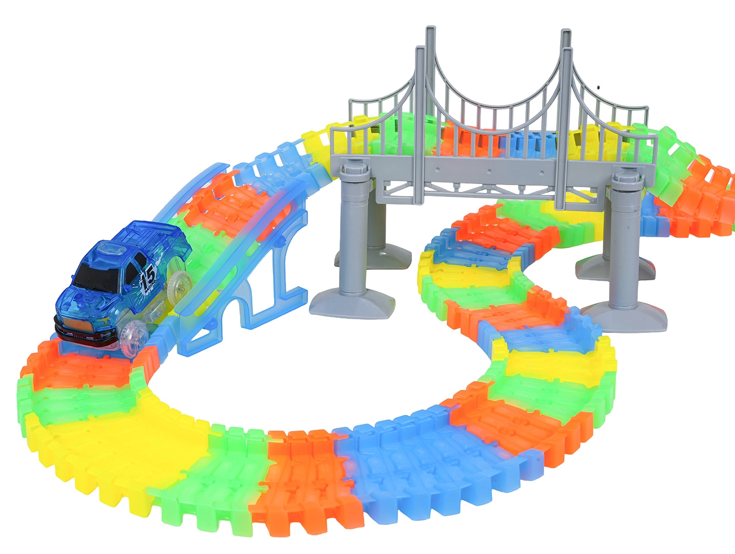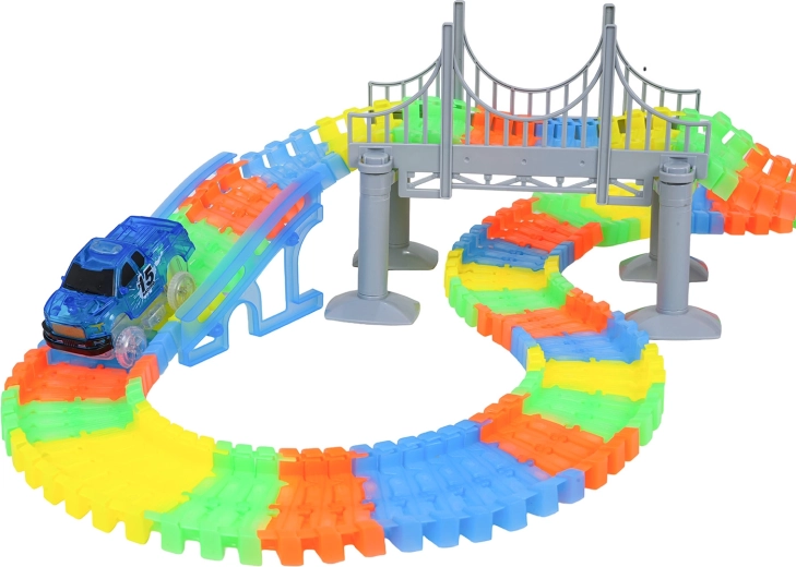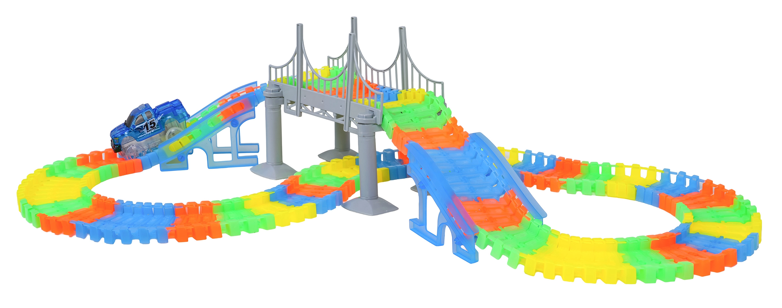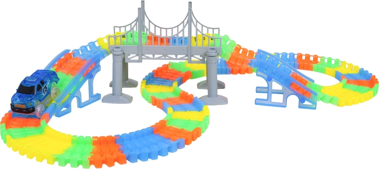 Deze creatieve racebaan biedt kinderen vanaf 3 jaar uren fantasierijk spel. De delen klikken eenvoudig in elkaar, de baan is buigbaar en draaibaar, zodat je bruggen, ramps en gedurfde bochten kunt maken. De fluorescerende afwerking van de rails laat de kamer oplichten wanneer het donker wordt.