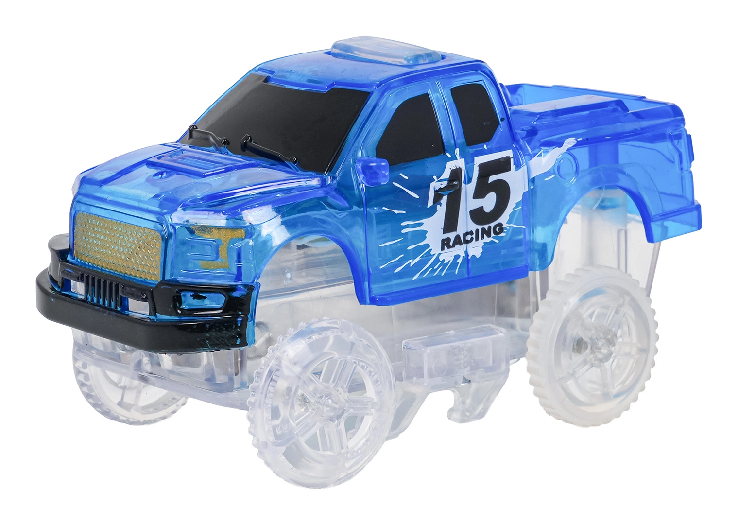 Het transparante raceautootje met LED-diodes brengt de baan tot leven. Druk gewoon op de knop op het dak. Voeding 2× AA (niet inbegrepen).