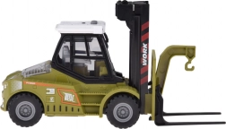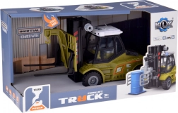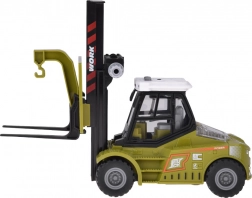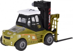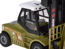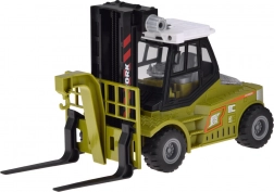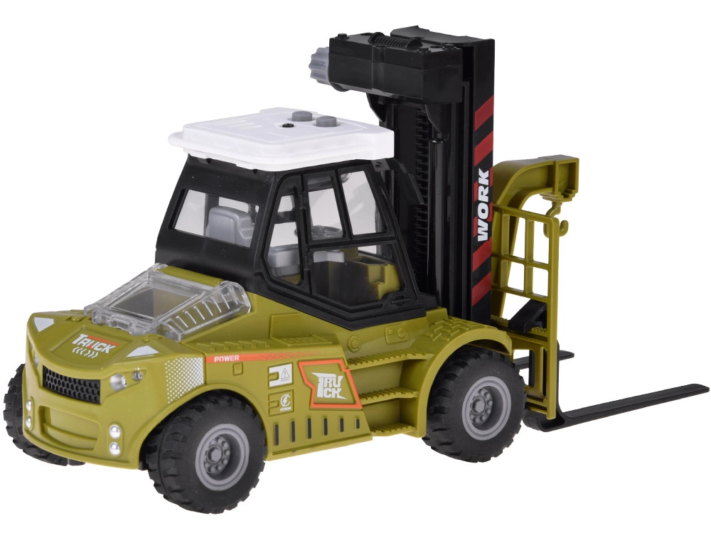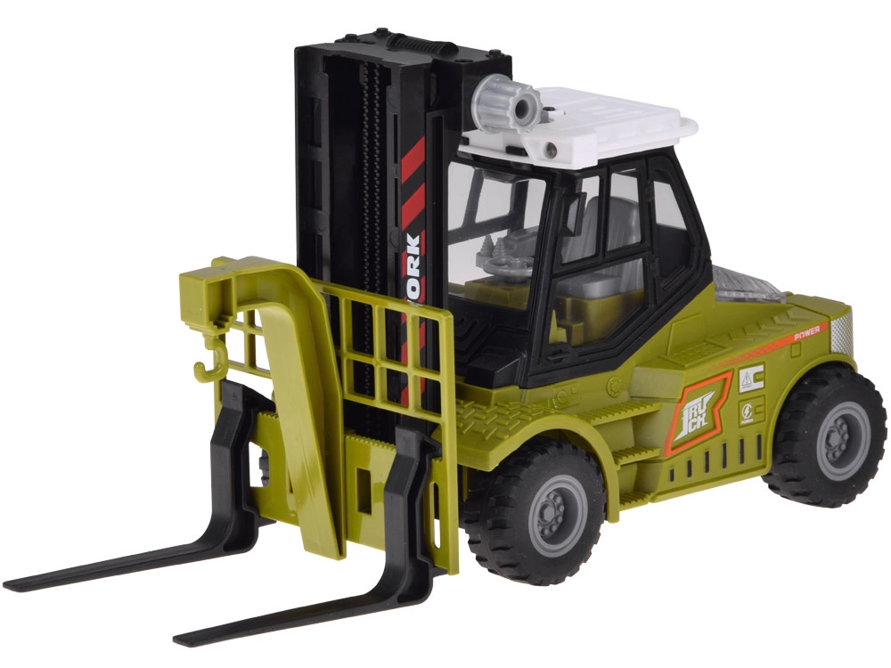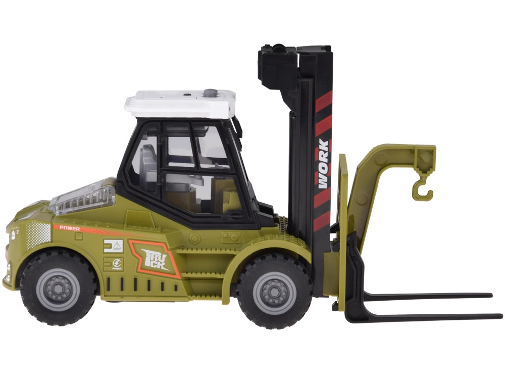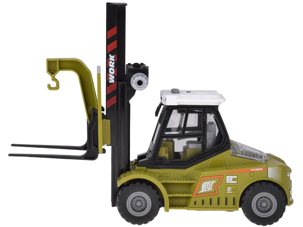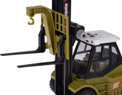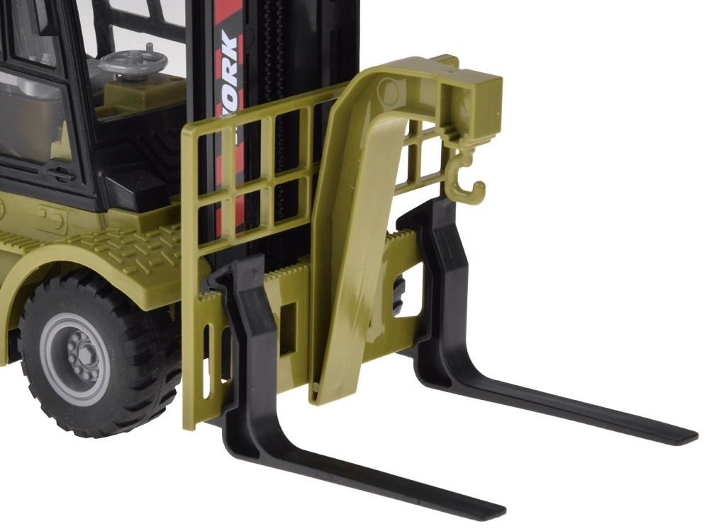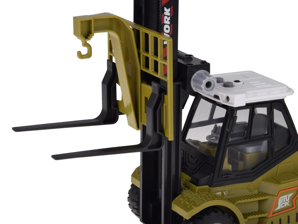 De vorken zijn handmatig te verbreden en te versmallen afhankelijk van de “lading”, en het heffen gebeurt via een comfortabele draaiknop. Verder is er een transparante, te openen “koffer” voor kleinigheden en rubberen wielen die soepel rijden en de vloer niet bekrassen. De robuuste uitvoering en gedetailleerde cabine stimuleren creatief, veilig en langdurig speelplezier.