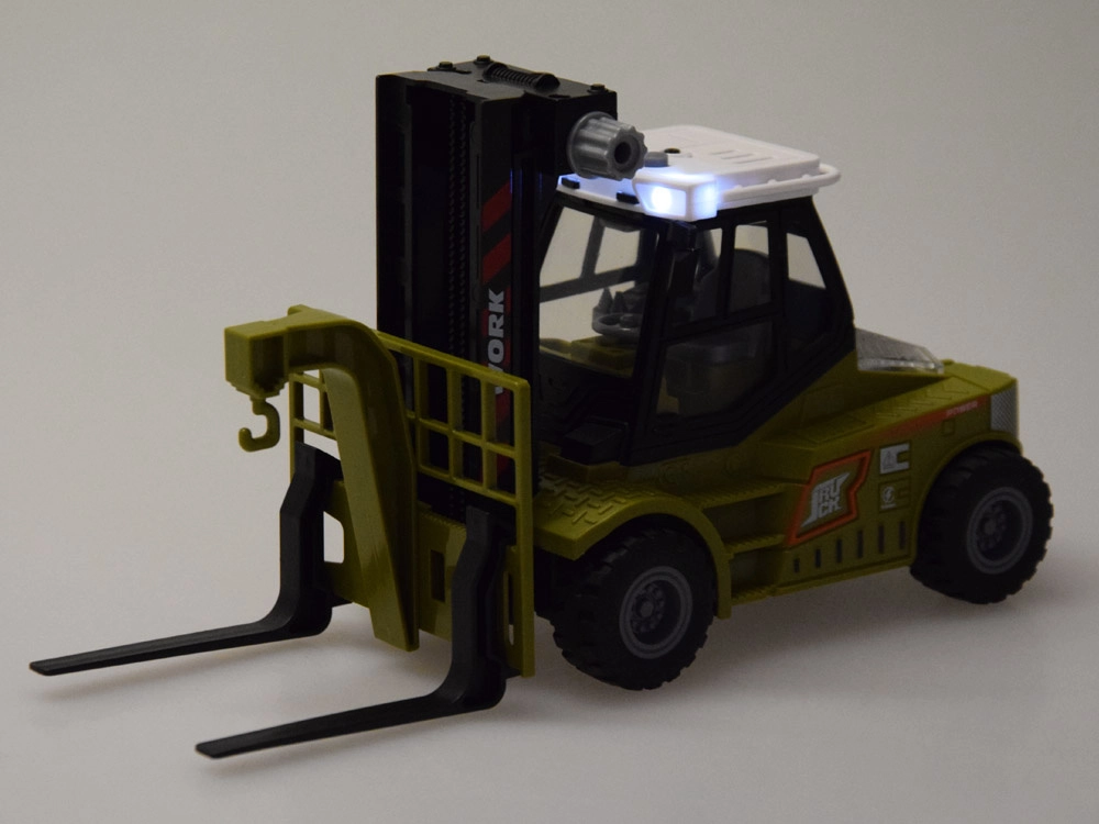 Twee knoppen bedienen 4 verschillende geluiden (starten, achteruitrijden, heffen, claxon), aangevuld met een knipperend wit licht voor maximaal speelplezier.