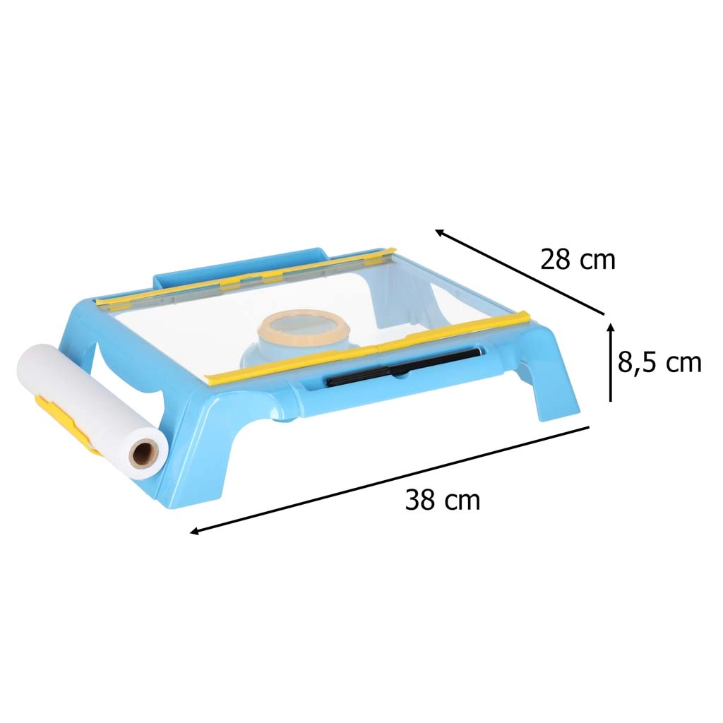 De stabiele kunststof basis met een schuin werkblad en een houder voor de papierrol zorgt voor comfortabele omstandigheden om te tekenen, thuis en onderweg.