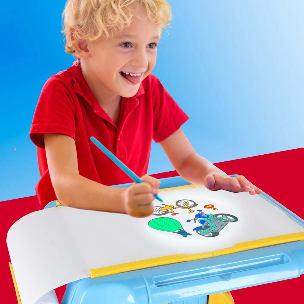 Open voor kinderen de deur naar de wereld van creativiteit met een praktische tafel en een LED‑projector voor eenvoudig overtrekken. De set stimuleert de fijne motoriek, concentratie en fantasie en bevat een papieren rol, viltstiften, kleurpotloden en 72 sjablonen om te tekenen. De ideale keuze voor leuke tekenlessen voor kinderen vanaf 3 jaar.