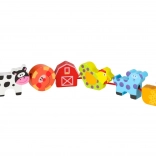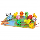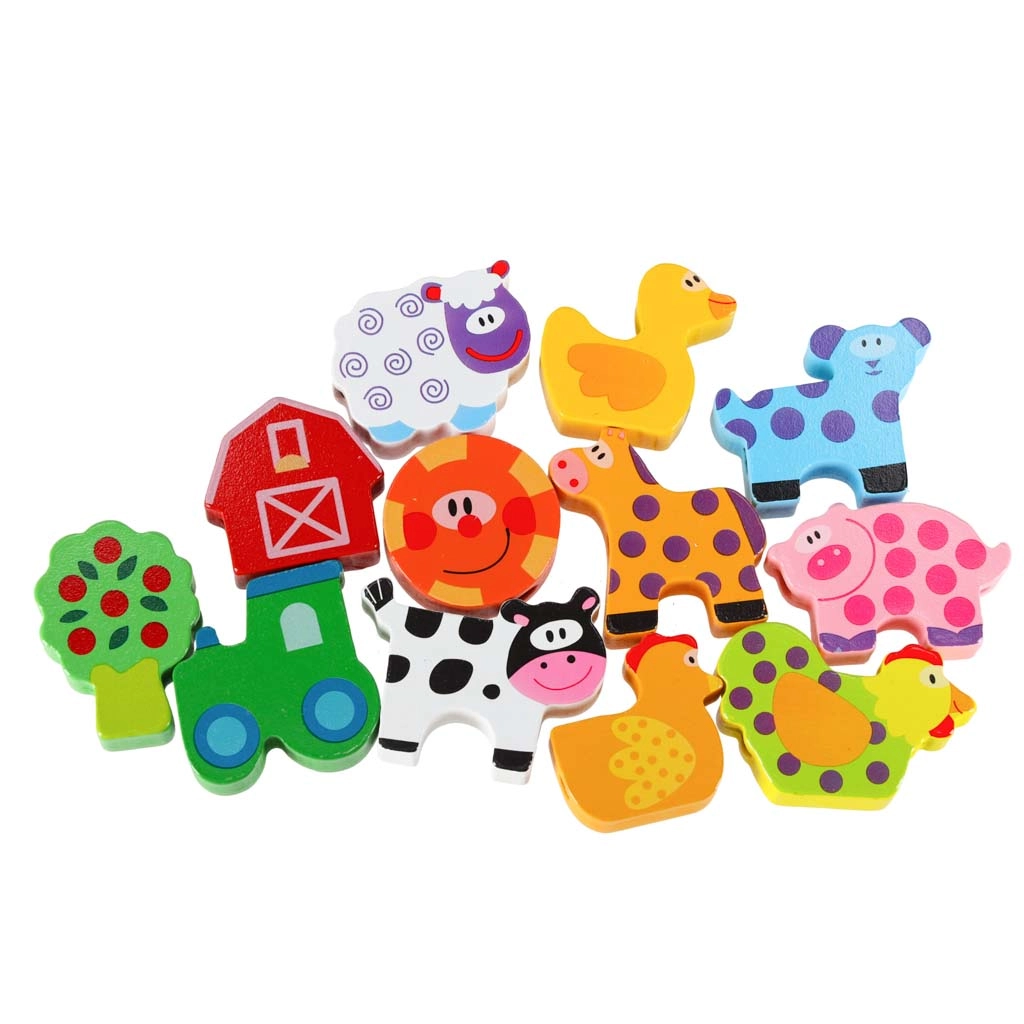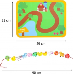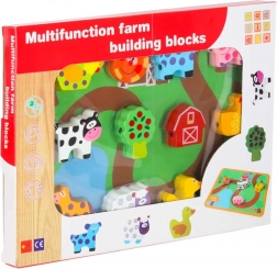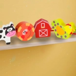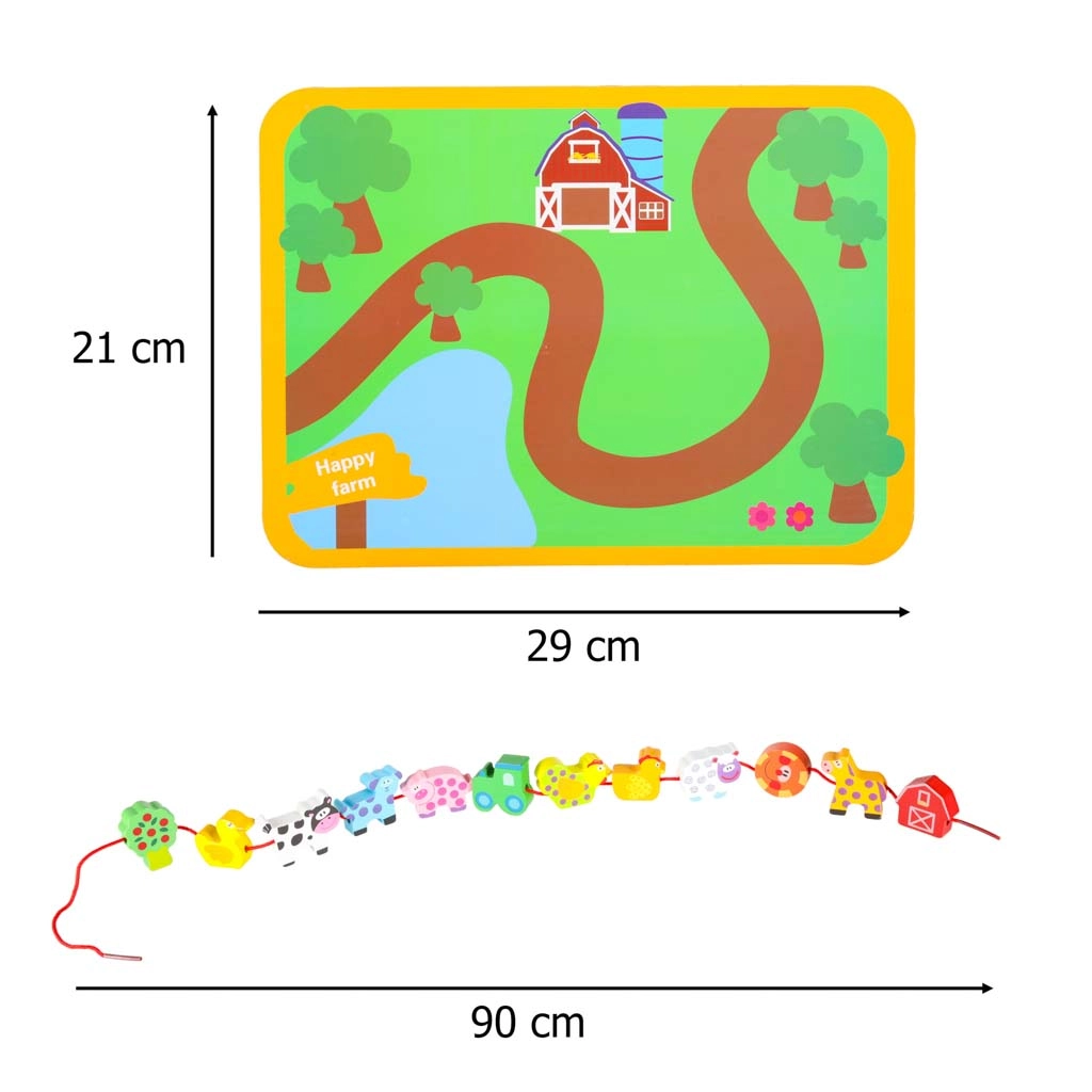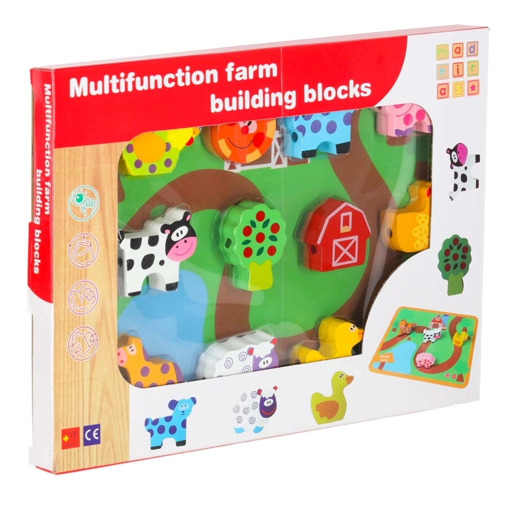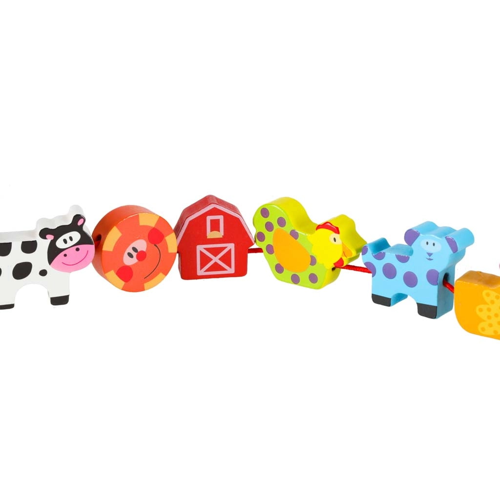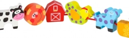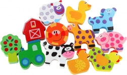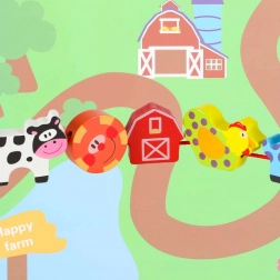 Deze kleurrijke houten set met boerderijmotieven combineert spel en leren. Kinderen kunnen dieren, een schuur, tractor en andere onderdelen aan het koord rijgen, scènes op het bijgeleverde bord leggen en zo motoriek, logisch denken en fantasie ontwikkelen. Glad afgewerkte, robuuste stukken liggen goed in kinderhanden.
