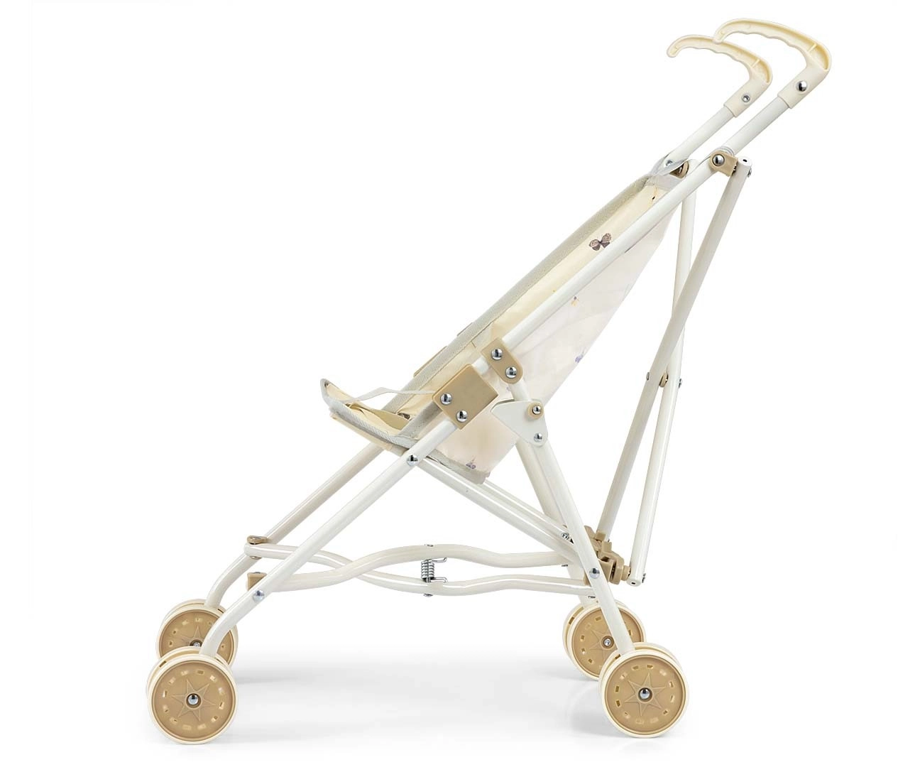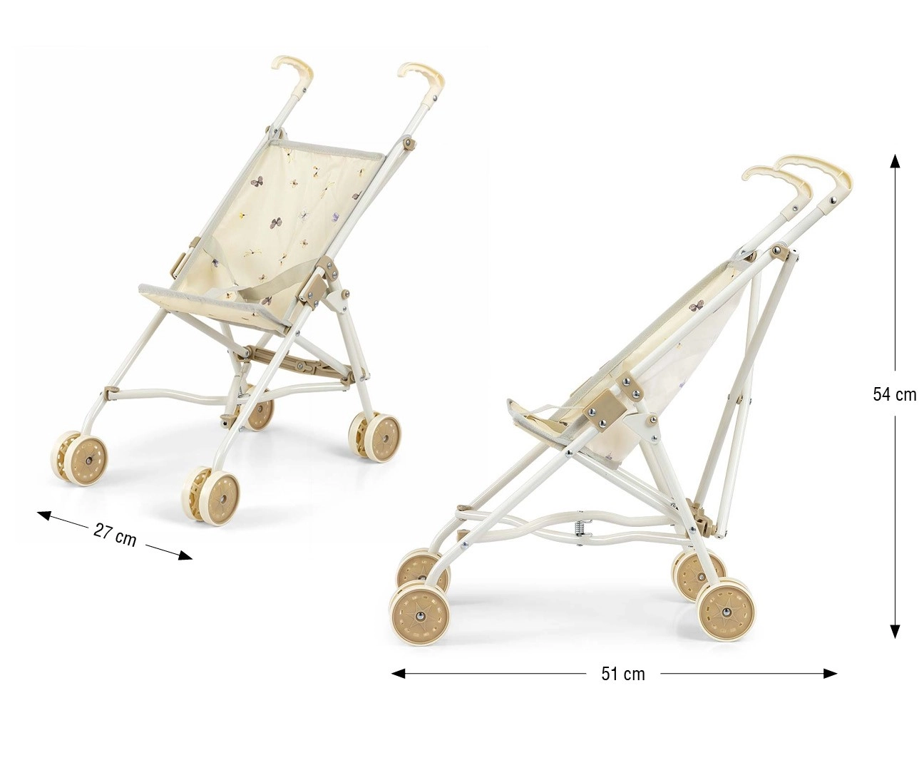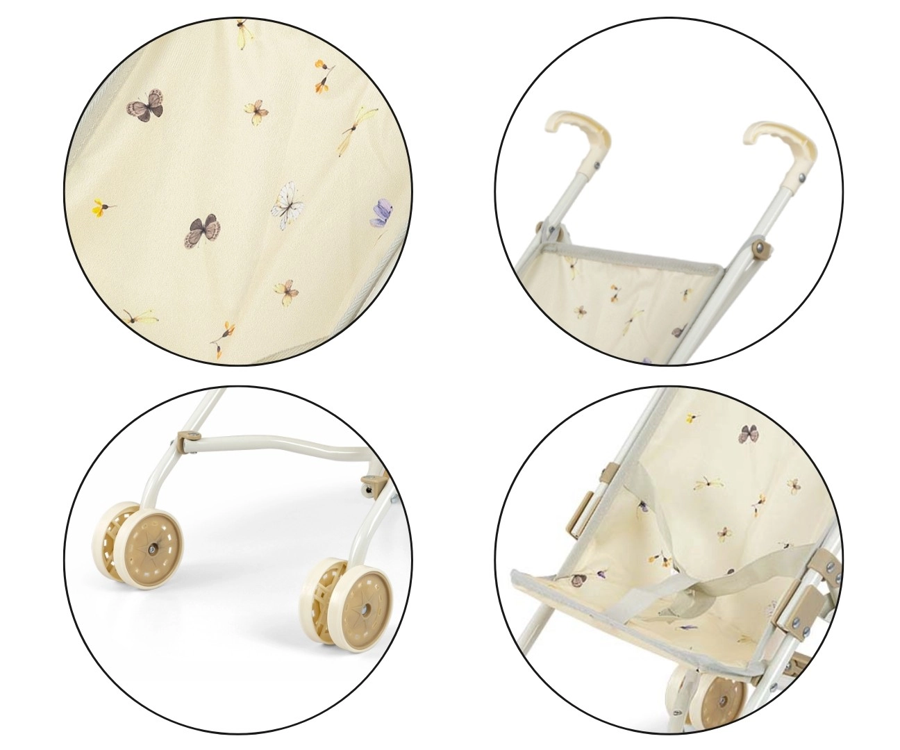 Dankzij het snelle paraplu-opvouwen kan de wagen plat worden opgeborgen, zodat hij thuis en onderweg weinig ruimte inneemt. Het metalen frame biedt stevigheid, de dubbele wieltjes zorgen voor soepel rijden en de veiligheidsriem houdt de pop veilig op zijn plaats.