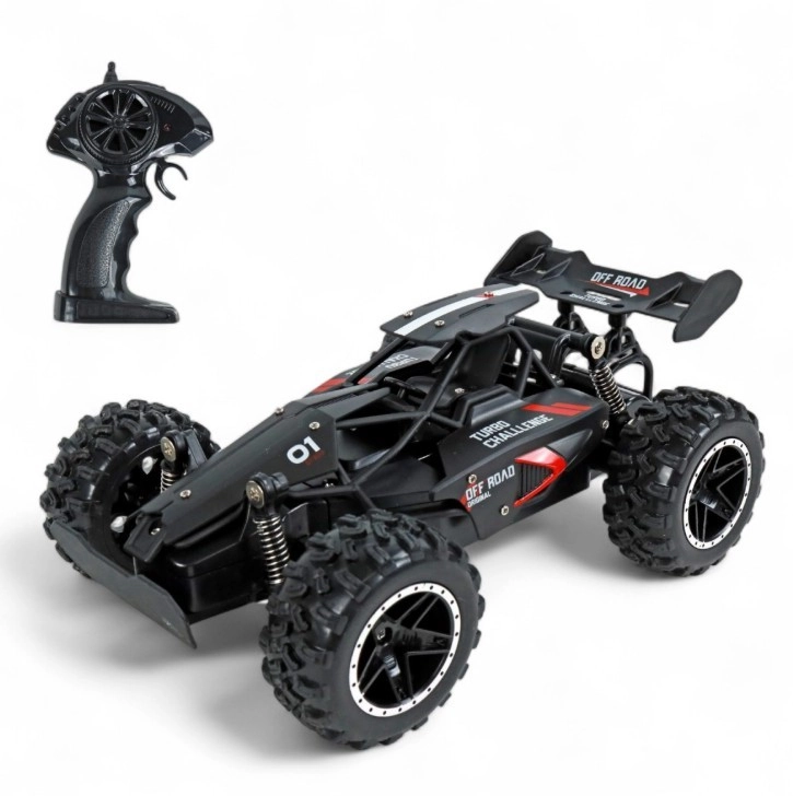 Beleef adrenaline met de RC auto TURBO CHALLENGE OFF ROAD op schaal 1:18. Dankzij de krachtige elektronica en onafhankelijke vering trotseert hij oneffenheden, stof en kleine obstakels. De stabiele 2,4 GHz-besturing zorgt voor vloeiende controle zonder interferentie en een rijtijd van ongeveer 15 minuten op topsnelheid.