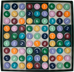 - 81 houten speelstenen (9 van elke kleur/cijfer), 9×9 speelbord, instructies met startpuzzels