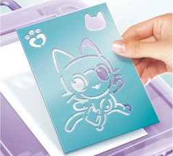 In de koffer vind je alles wat je nodig hebt om originele afbeeldingen te maken: een elektronische airbrush, 8 stiften, 10 sjablonen, 10 vellen papier en een stickervel. De sjablonen zijn herbruikbaar, zodat kinderen steeds nieuwe motieven kunnen creëren en hun verbeelding kunnen ontwikkelen.