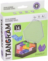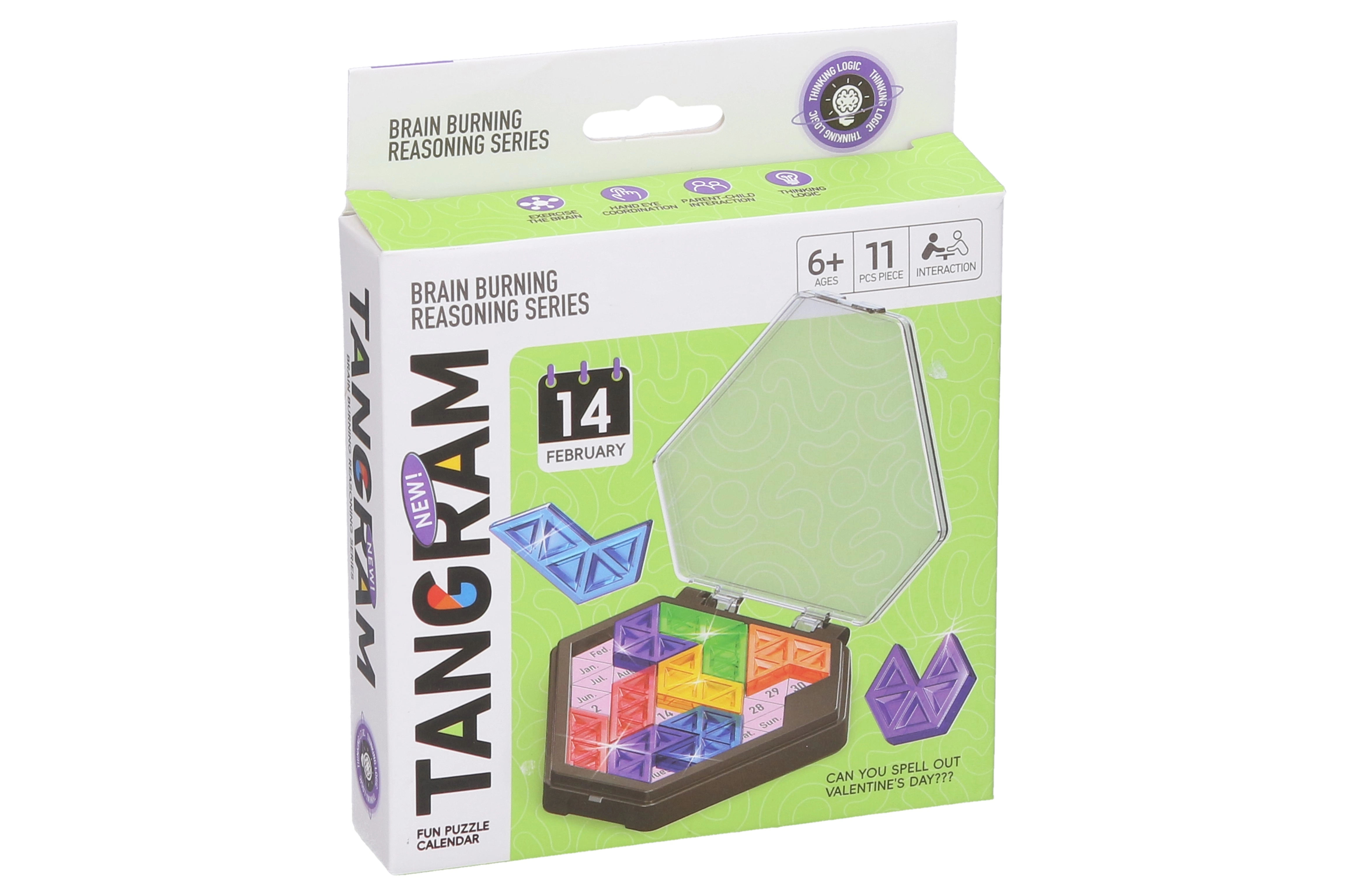De Tangram-puzzel 10 cm is ideaal voor kinderen en volwassenen die van slimme uitdagingen houden. Met de meegeleverde sjablonen leg je niet alleen klassieke vormen, maar ook originele figuren met thema’s van feestdagen en speciale gelegenheden. De opdracht is duidelijk: leg de stukjes zo dat alleen de opgegeven datum en dag van de week zichtbaar blijven.