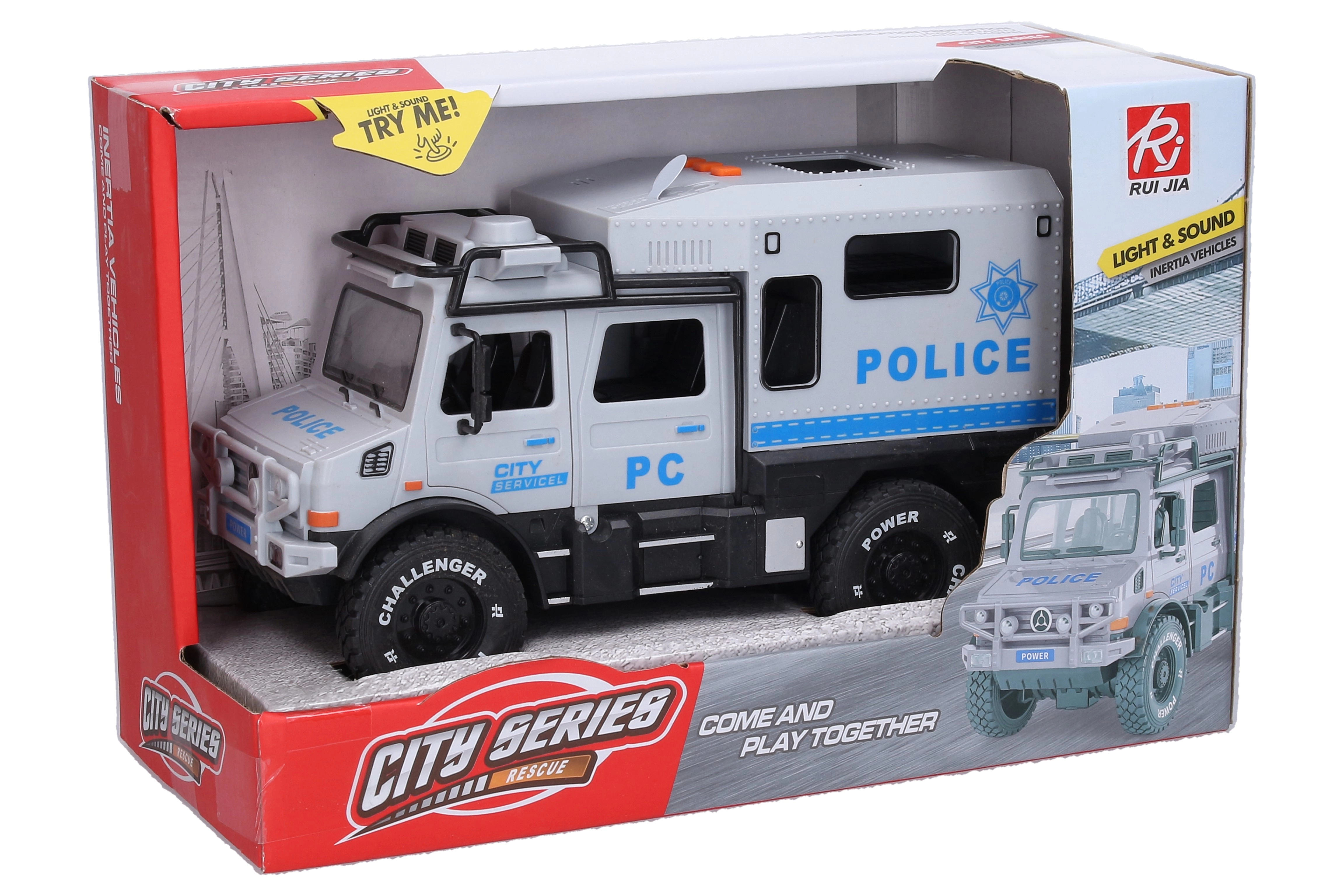 Ga op missie met het gepantserde politievoertuig, dat uitblinkt door zijn gedetailleerde afwerking en uitgebreide functies. Dankzij de frictie-aandrijving rijdt het voertuig na een duwtje weg en zorgen de effecten voor nog realistischer speelplezier.