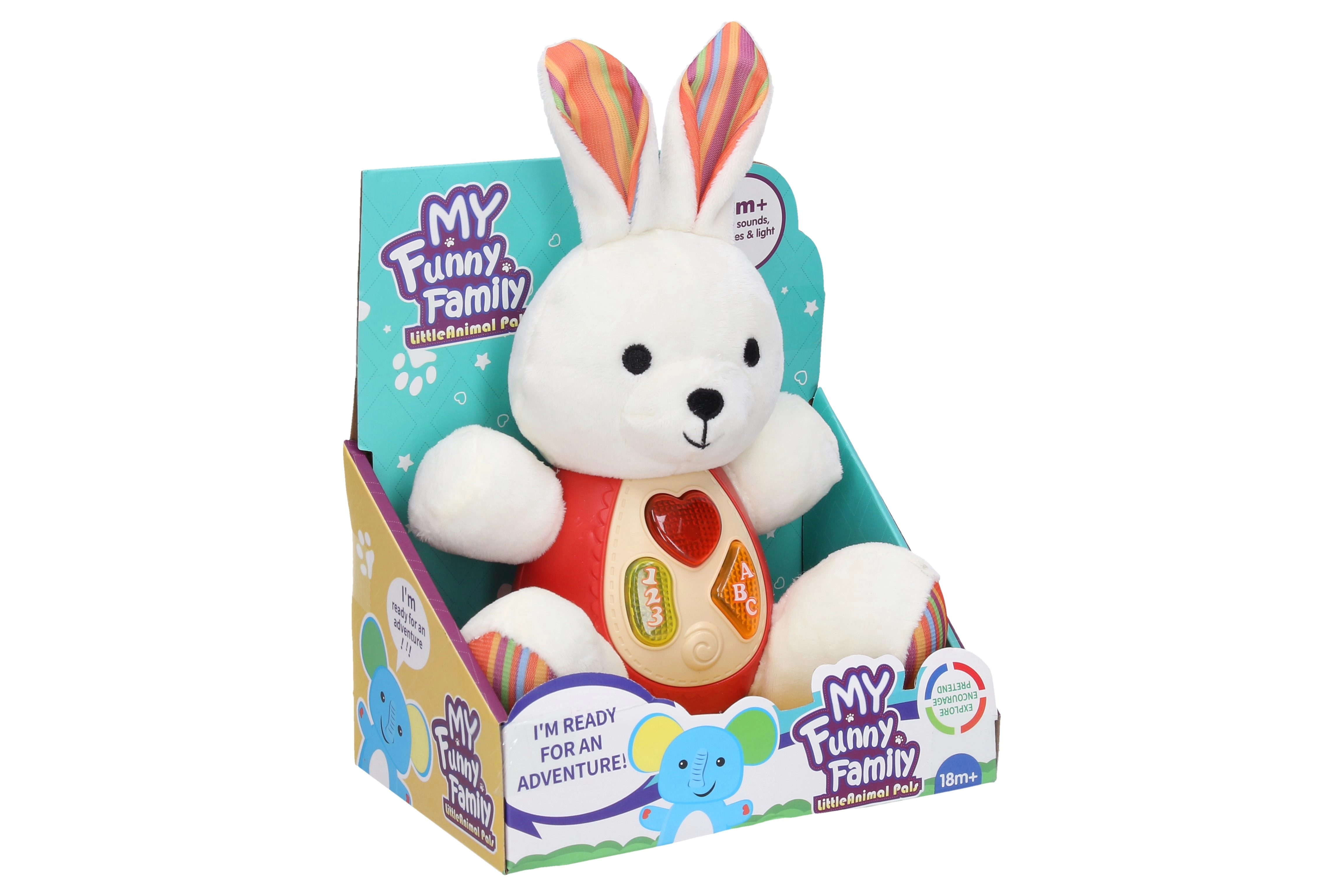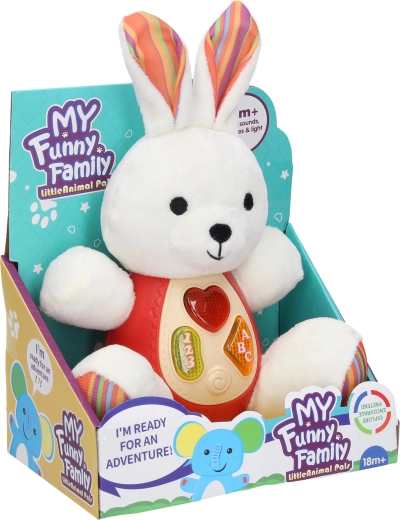 Dit heerlijk zachte interactieve konijntje is een geweldige vriend voor de eerste ontdekking van geluiden en lichtjes. Het combineert een aangenaam pluche oppervlak met een duurzaam kunststof buikje, waarop kinderen eenvoudig melodieën, geluiden en lichteffecten kunnen activeren. Dankzij de compacte afmetingen ligt het prettig in de hand en is het ideaal om mee te spelen, thuis en onderweg.