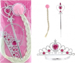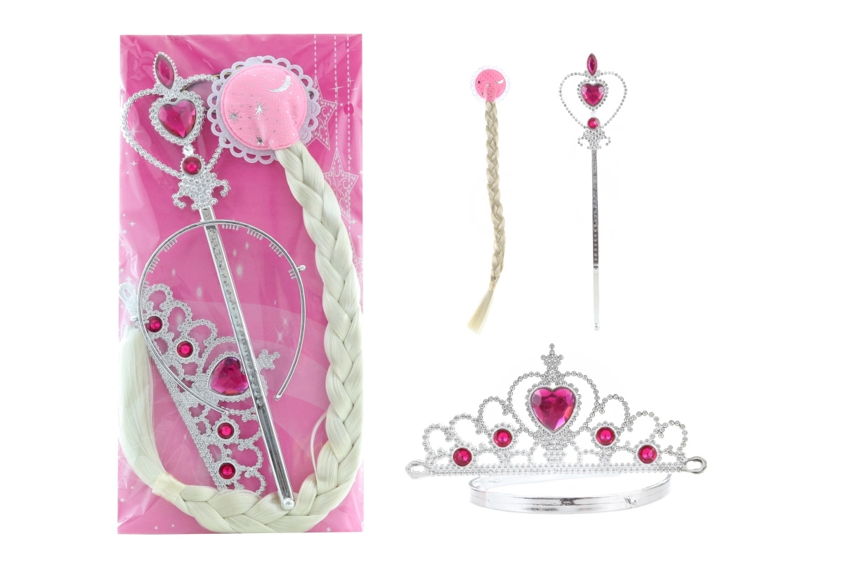 - Complete prinsessenuitrusting – kroon, scepter en lange blonde vlecht in één verpakking.