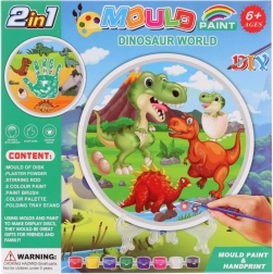 - 5 zakjes gips, 8 kleurtjes, kom, 2 penseeltjes, ronde mal met dinomotieven, kunststof standaard