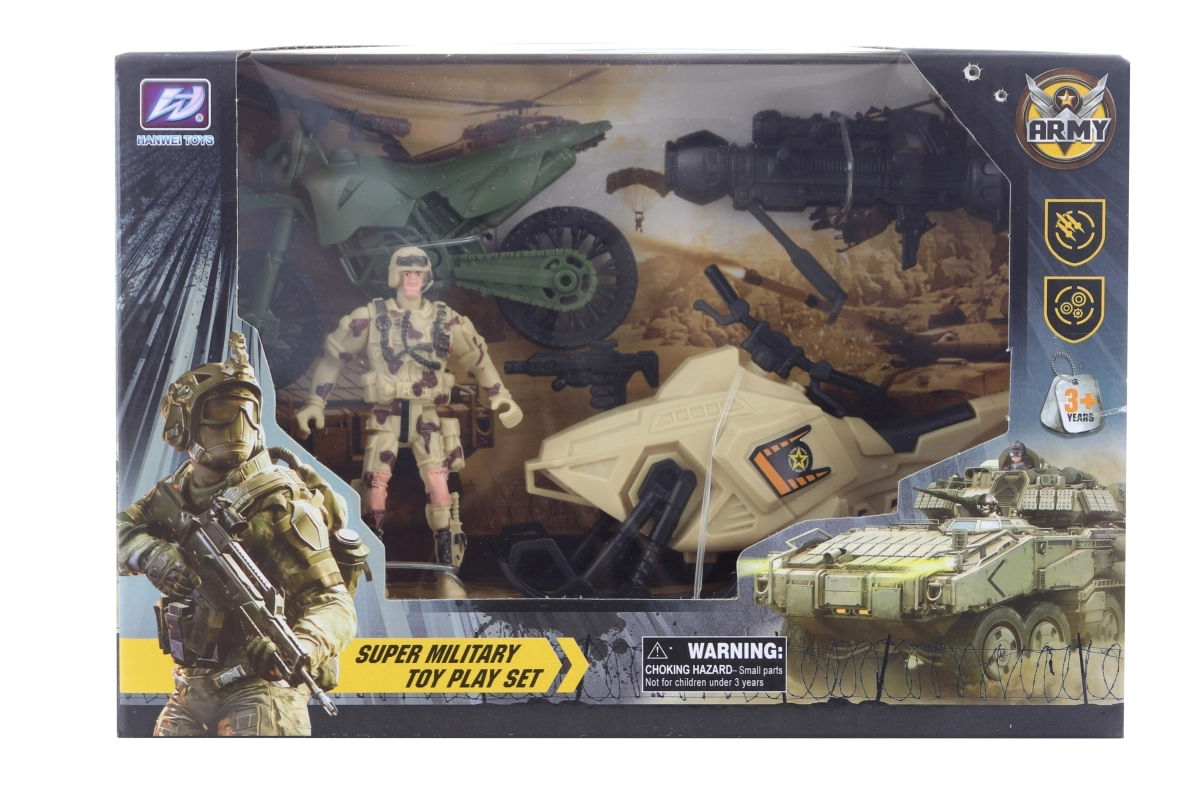 Ontdek het plezier met de complete militaire set met scooter, die kleine avonturiers vanaf 3 jaar zal verrassen. De set biedt een duurzame kunststof uitvoering, is veilig verpakt in een doos en ideaal voor creatief spel en het ontwikkelen van de verbeelding.