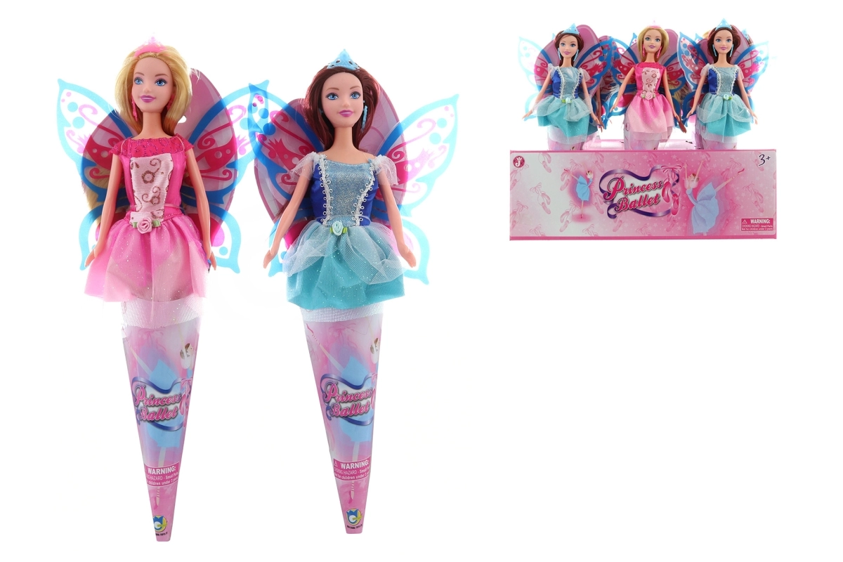Elegante accessoires zoals een kroontje en oorbellen geven de pop een sprookjesachtige touch. De pop is gemaakt van duurzaam kunststof, terwijl de kegel van papier is, waardoor hij perfect is als cadeauverpakking.