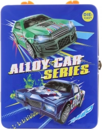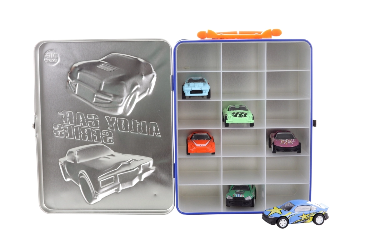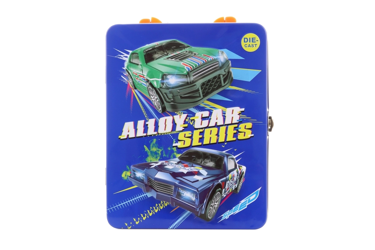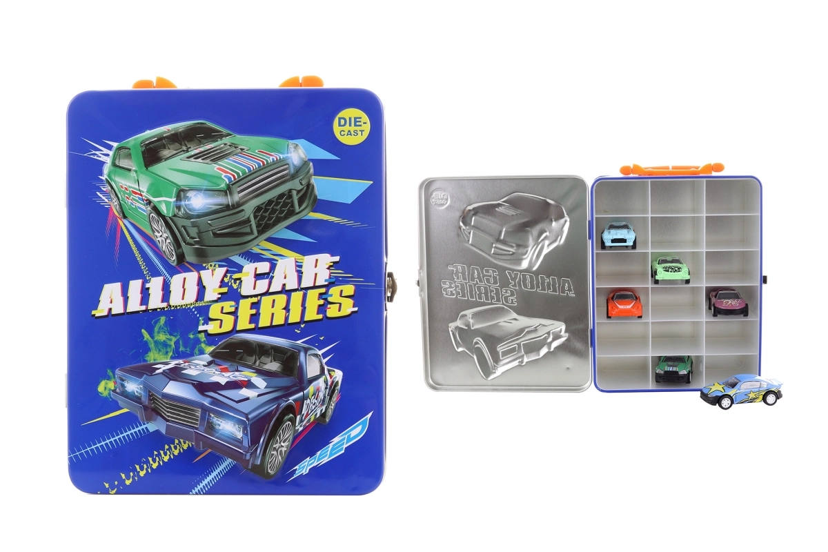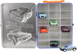 Praktische blikken box met 6 metalen autootjes met pullback-mechanisme voor kleine racers en verzamelaars. De stevige doos biedt plaats aan tot 18 autootjes en is ideaal voor opbergen, meenemen en cadeauverpakking. De compacte afmetingen van de box en autootjes zijn perfect voor kinderhanden en voor spelen thuis en onderweg.