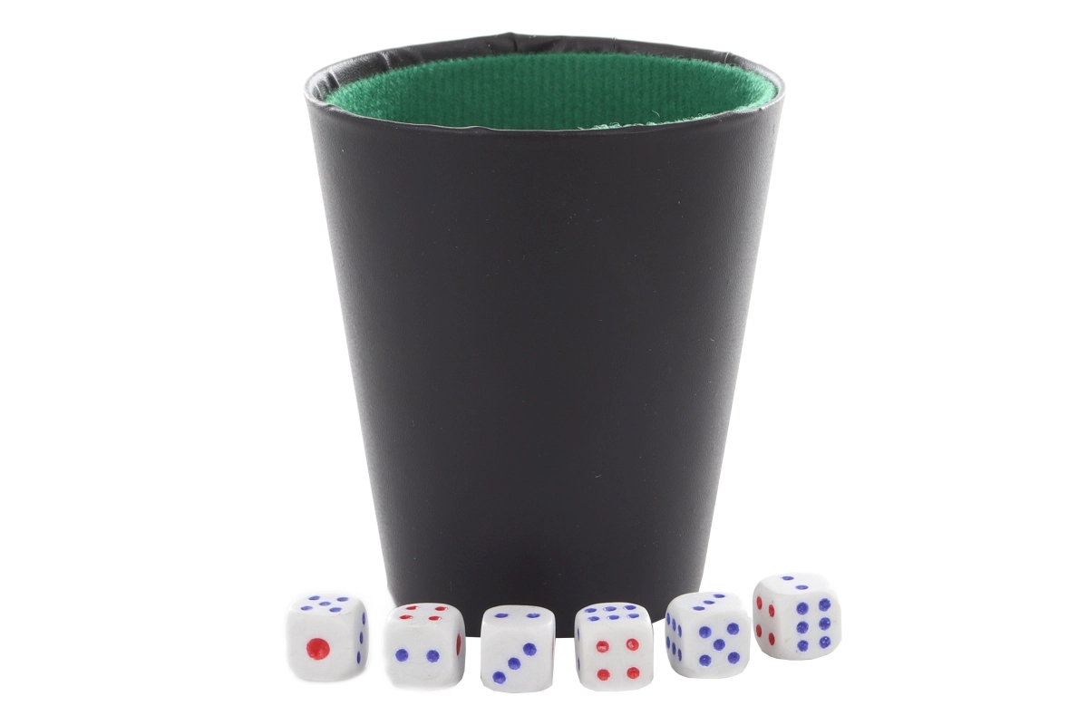 Geniet van comfortabel en verfijnd dobbelen met de kunststof beker met vilten binnenkant, die het geluid dempt en helpt de dobbelstenen onder controle te houden. De set bevat zes standaard dobbelstenen van ongeveer 1,2 cm – ideaal voor klassieke bordspellen.