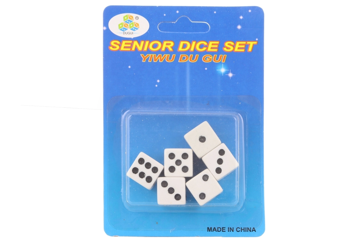 Praktische set dobbelstenen in blisterverpakking bevat 6 kunststof dobbelstenen met een formaat van ca. 1,5 cm. De compacte verpakking (ca. 9 × 12,5 cm) is ideaal voor onderweg, voor thuis in spellensets en als reserve dobbelstenen.