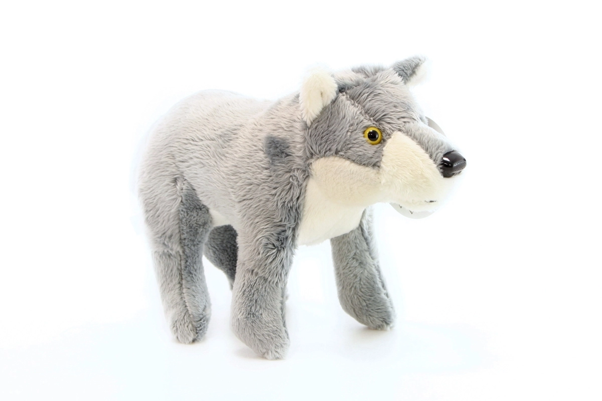 Deze pluchen wolf betovert met zijn gedetailleerde afwerking en aangenaam materiaal dat uitnodigt tot knuffelen. Dankzij de staande houding oogt hij realistisch en past hij niet alleen in de kinderkamer, maar ook als decoratie voor natuurliefhebbers.