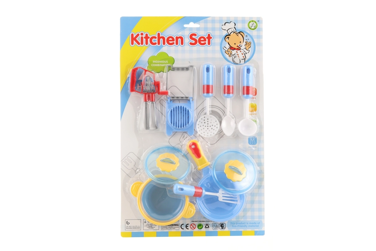 Speelset voor het kinderkeukentje voor kleine koks bevat alles wat nodig is om koken na te spelen. Je vindt erin een pan met deksel, een koekenpan met deksel, een spatel, opscheplepels, een eiersnijder en een handklopper. Verpakt op blister, ideaal als cadeau. Geschikt vanaf 3 jaar.