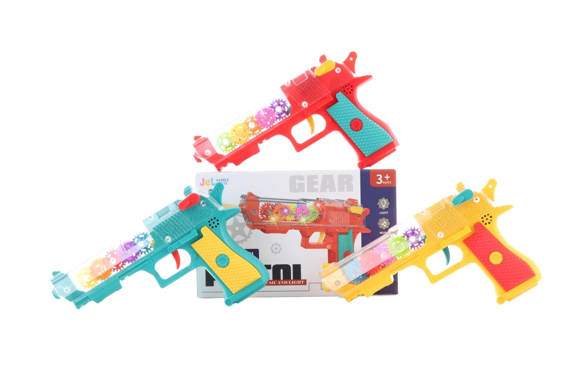 Een leuk speelgoedpistool op batterijen dat voor veel actie zorgt: bij het overhalen van de trekker licht het op, maakt het schietgeluiden en draaien de tandwielen. Ideaal speelgoed voor kinderen vanaf 3 jaar, gemaakt van duurzaam plastic.