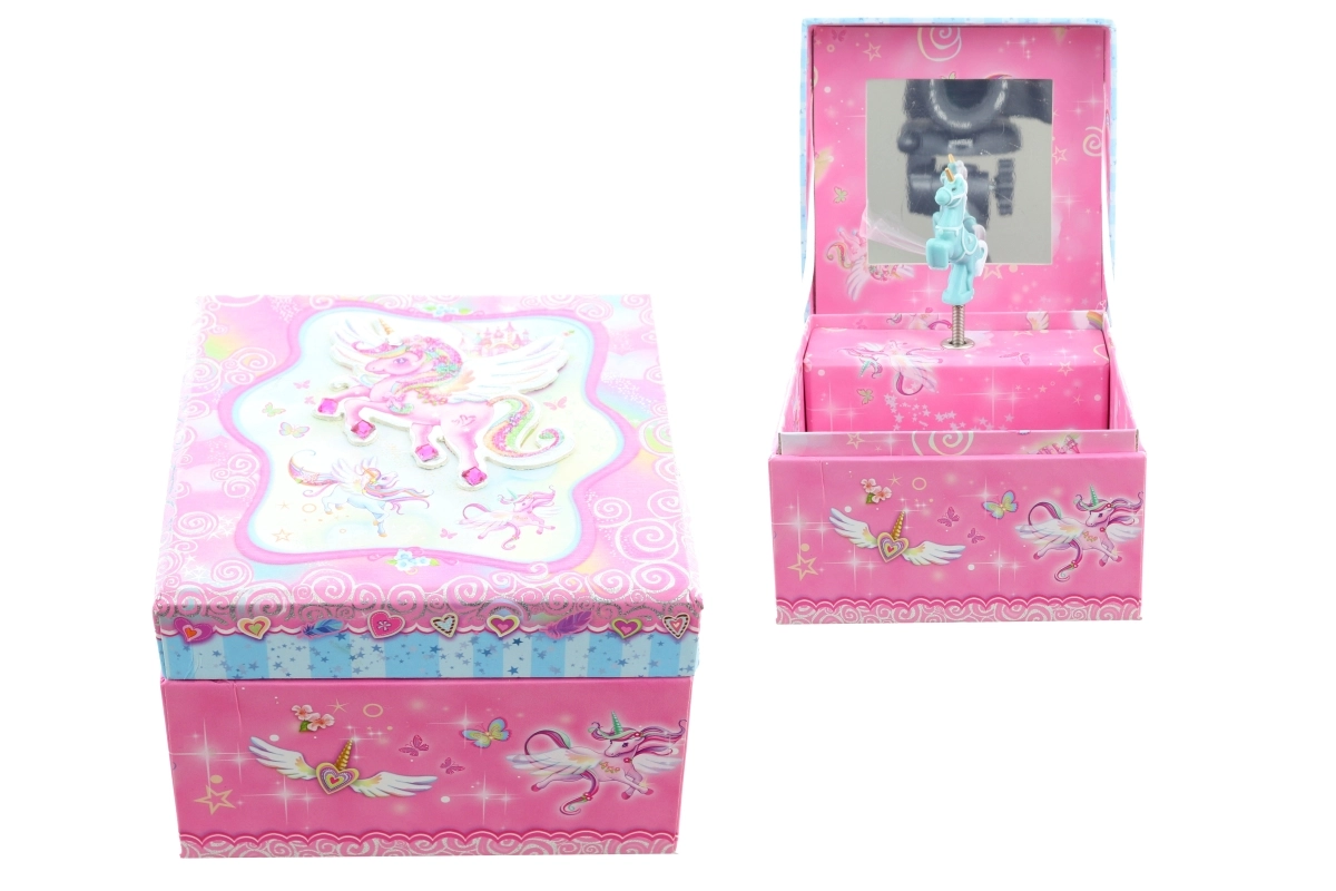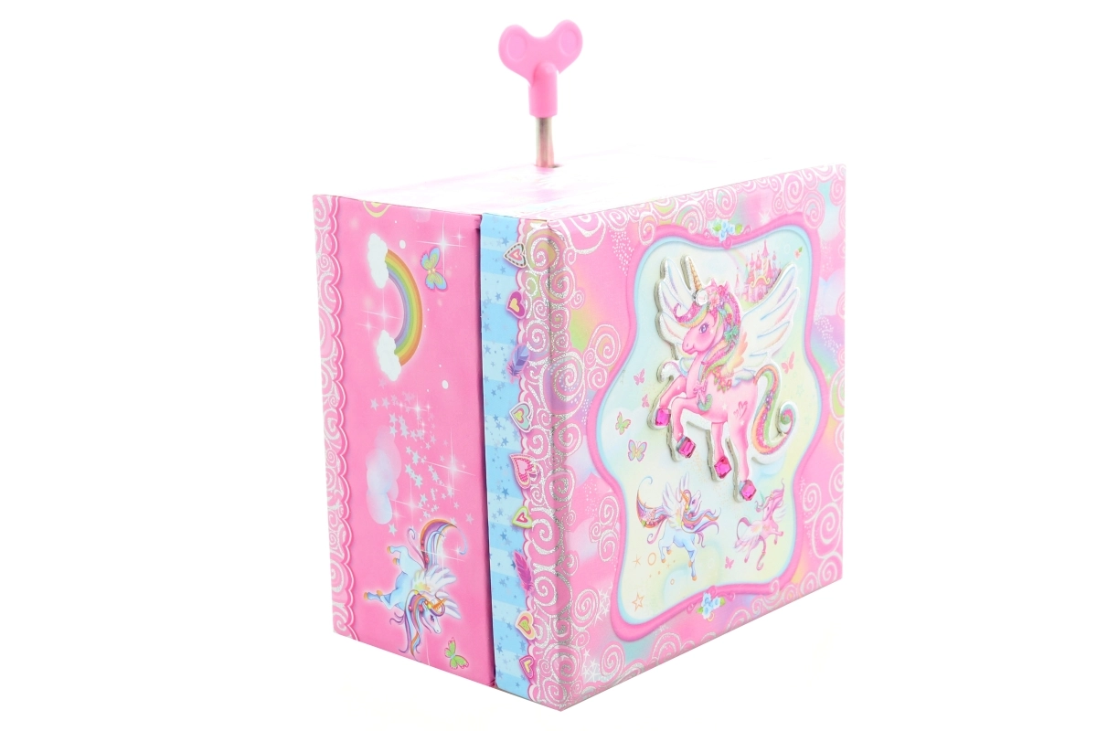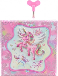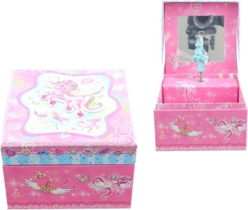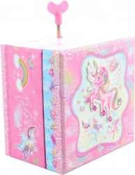 Deze muzikale sieradendoos in de vorm van een kistje is ideaal voor het bewaren van ringen, oorbellen en andere kleinigheden. Bij het openen van het deksel, en na het opdraaien van het sleuteltje, komt het eenhoornfiguurtje tot leven en klinkt een aangename melodie die voor een sprookjesachtige sfeer zorgt. Binnenin bevindt zich een spiegeltje voor een snelle look-check.