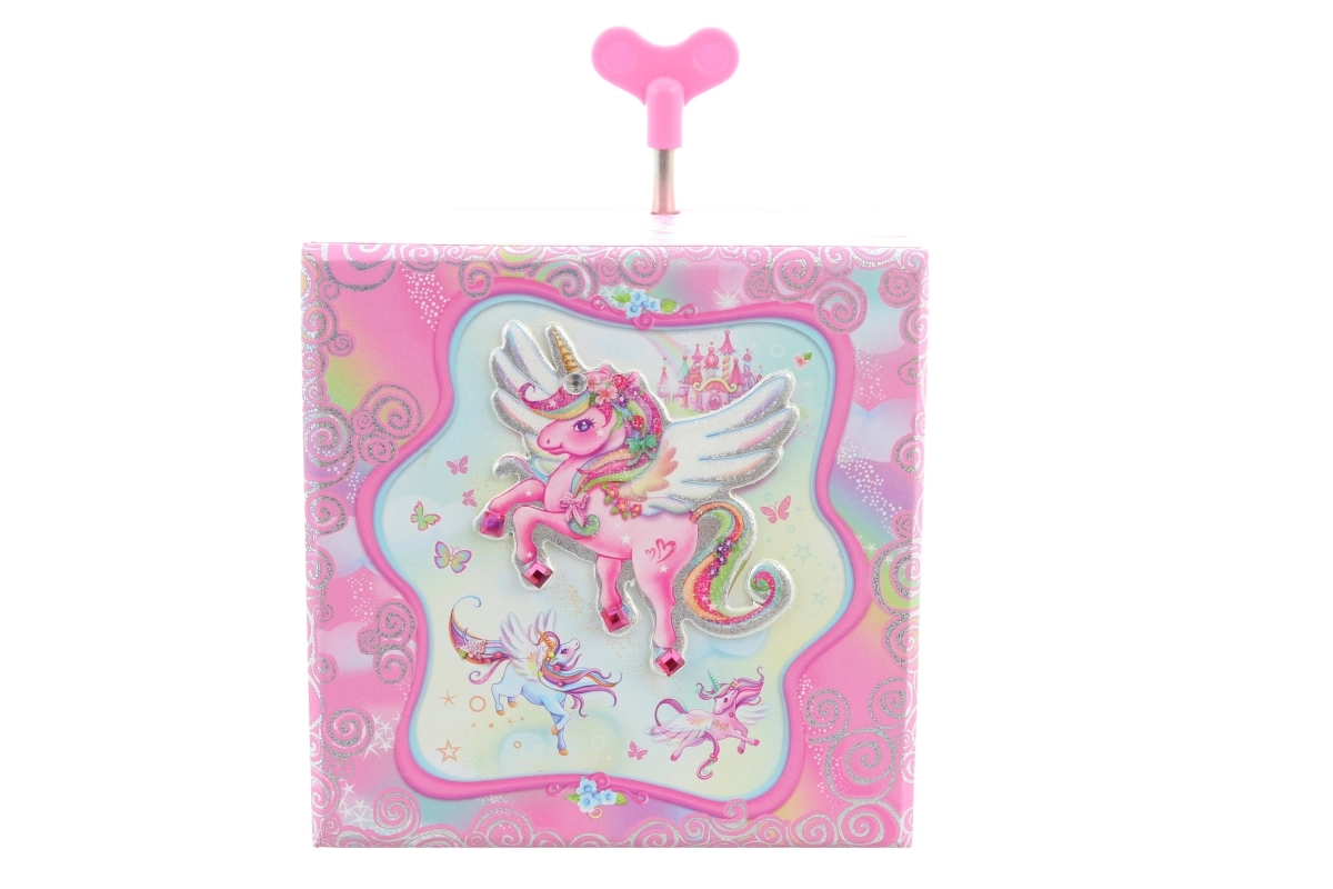 Stijlvolle muzikale sieradendoos met een eenhoornthema die zowel kleine als grote liefhebbers van magisch design zal bekoren. Na het opdraaien van het sleuteltje begint het eenhoornfiguurtje te draaien en klinkt er een melodie. Binnenin vind je een praktisch spiegeltje en ruimte voor kleine schatten. Magisch motief, dansende eenhoorn en een opwindbaar muziekmechanisme maken van dit kistje een prachtig cadeau én decoratie.