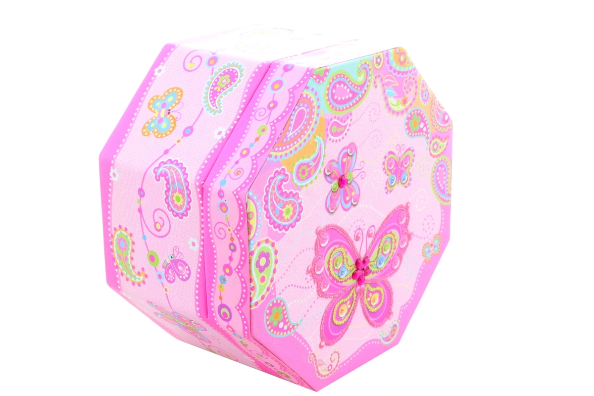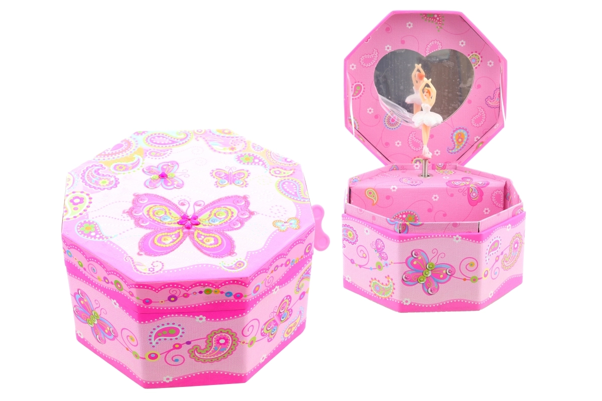 Betoverende muzikale sieradendoos met vlindermotief die de charme van klassieke speeldozen oproept. Na het opdraaien draait de ballerina binnenin rond, dansend op een aangename melodie. Binnenin vind je ook een praktisch spiegeltje, dat het opbergen en controleren van sieraden vergemakkelijkt.
