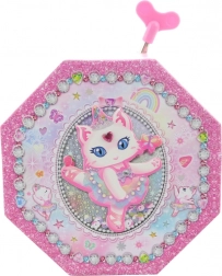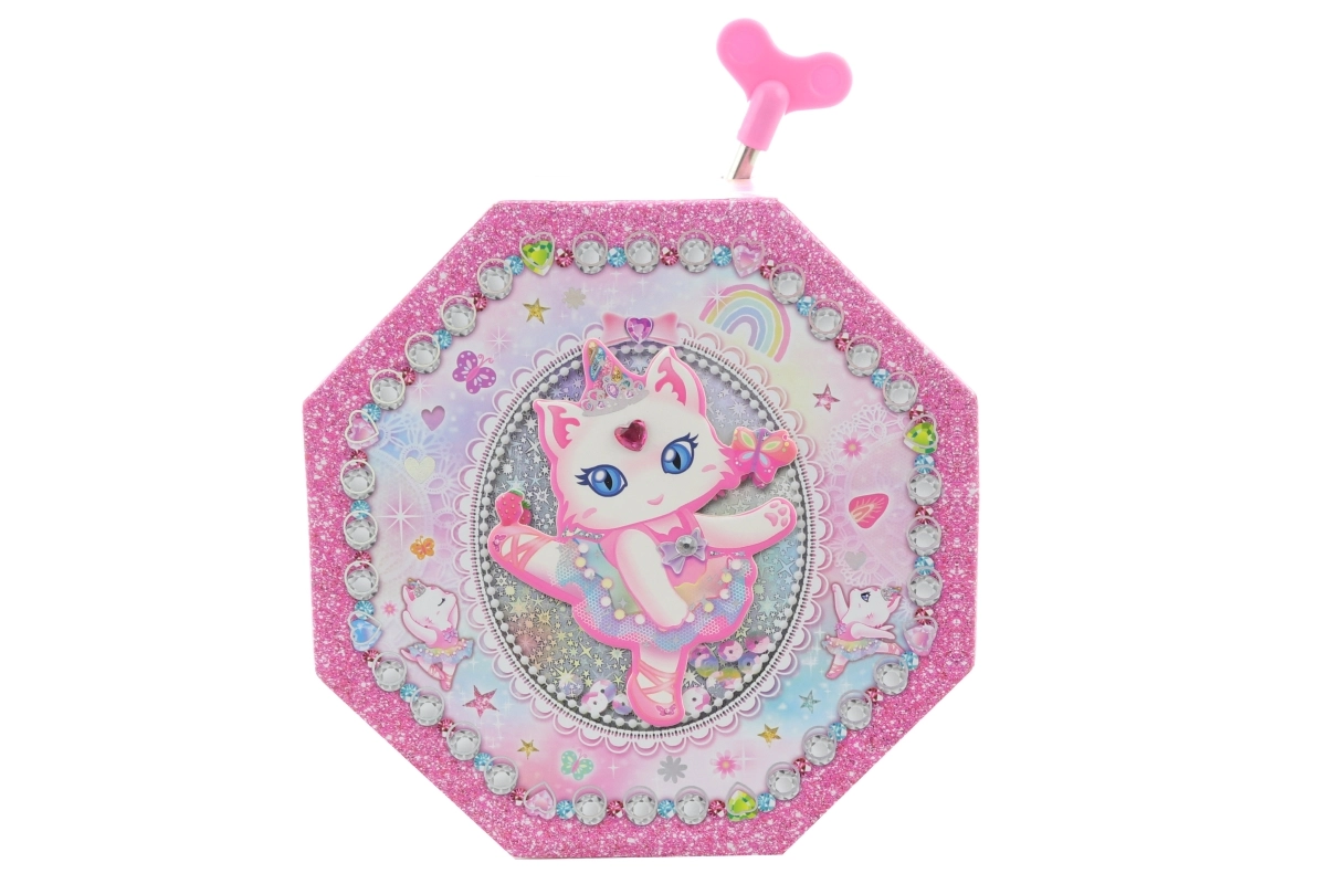 Deze elegante roze muziekjuwelendoos combineert een charmant design met praktische opbergruimte. Na het opdraaien van de mechanische sleutel draait de ballerina voor het spiegeltje en klinkt er een melodie die elk openen van het deksel opluistert. De juwelendoos is versierd met schattige illustraties van katten en eenhoorns, glitters en decoratieve steentjes.