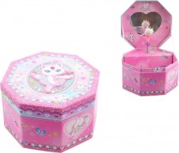 Na het openen draait de ballerina voor het hartvormige spiegeltje en klinkt er een melodie die het opbergen van sieraden veraangenaamt.