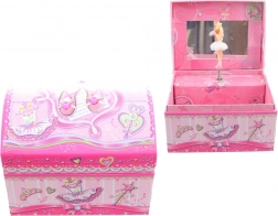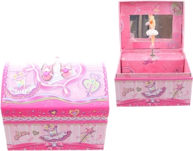 Dit charmante juwelendoosje in de vorm van een kistje is de ideale plek om ringen, oorbellen en andere hebbedingen op te bergen. Na het opdraaien van het sleuteltje en het openen van het deksel draait de ballerina voor het spiegeltje en klinkt er een melodie die een magische sfeer creëert.