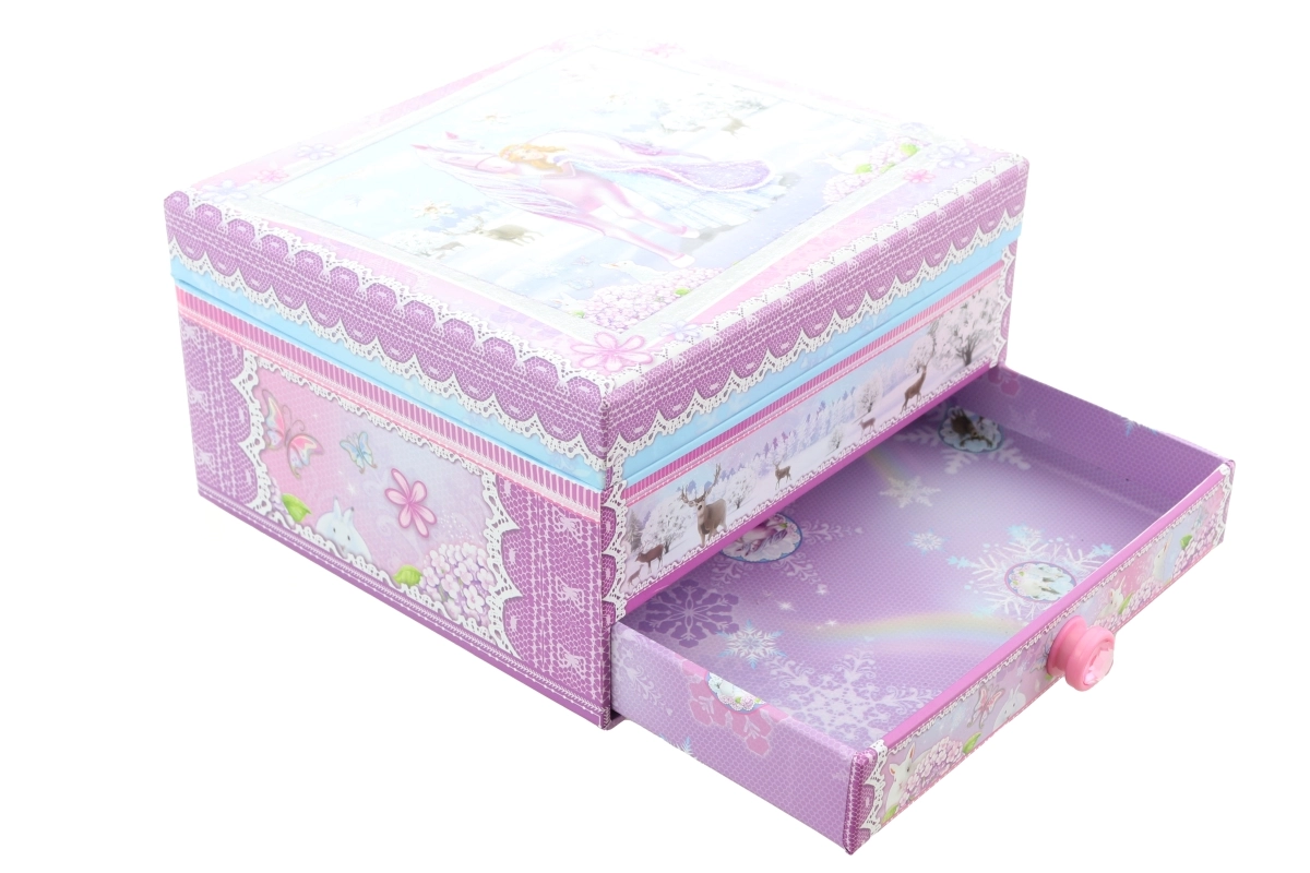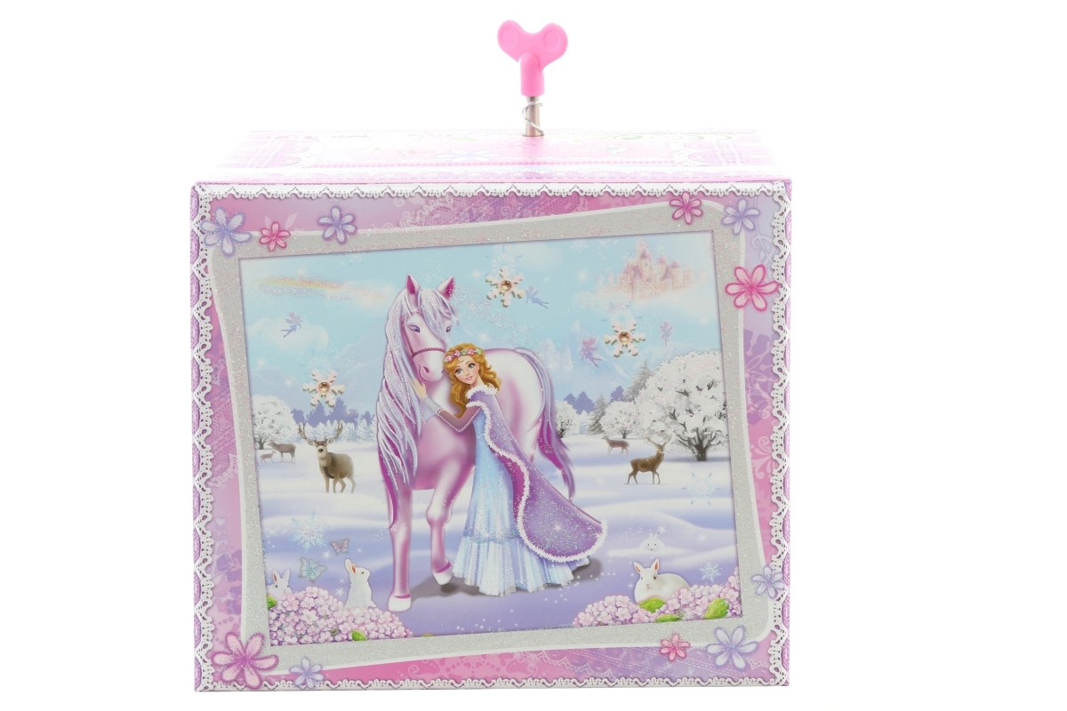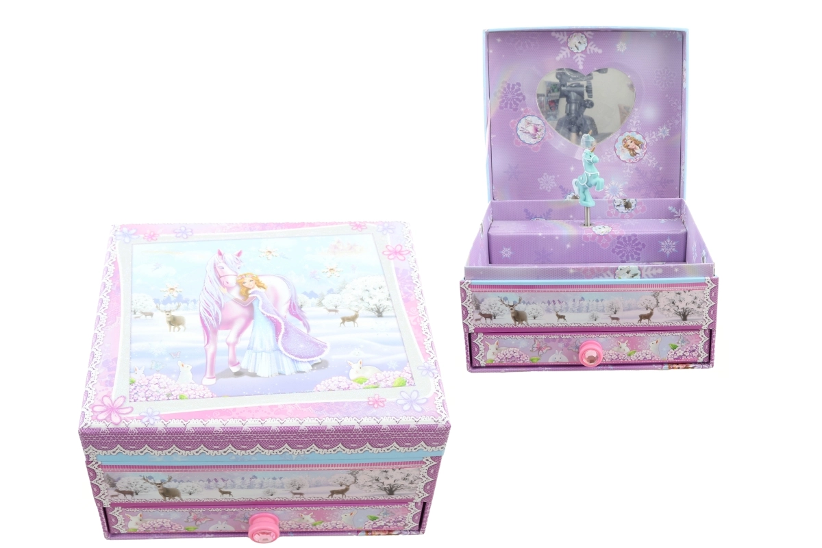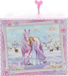 Deze elegante muzikale sieradendoos met een winterprinses en eenhoorn combineert een decoratieve uitstraling met een praktische indeling. Na het opwinden van het mechanische uurwerk en het openen van het deksel begint het figuurtje te draaien en klinkt er een melodie die voor een magische sfeer zorgt.