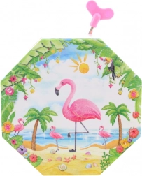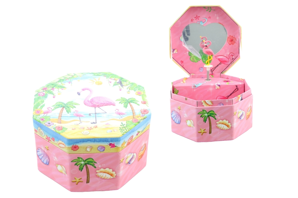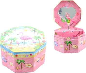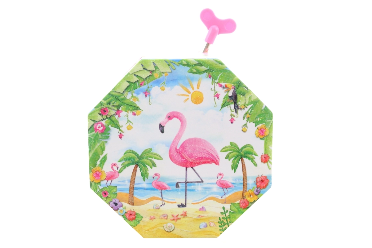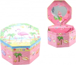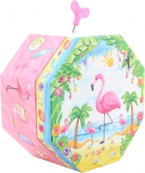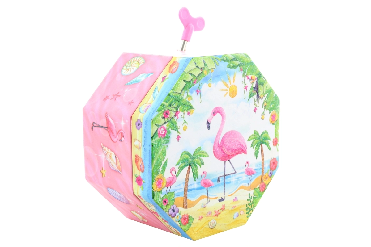 Deze betoverende muzikale sieradendoos in roze onderscheidt zich door haar achthoekige vorm en tropisch motief met flamingo, palmen en schelpen. Bij het openen verschijnt een dansende flamingo voor een hartvormige spiegel, die gaat ronddraaien na het opdraaien van het sleuteltje en het opbergen van sieraden begeleidt met een aangename melodie.