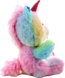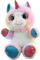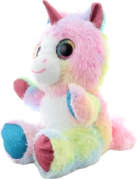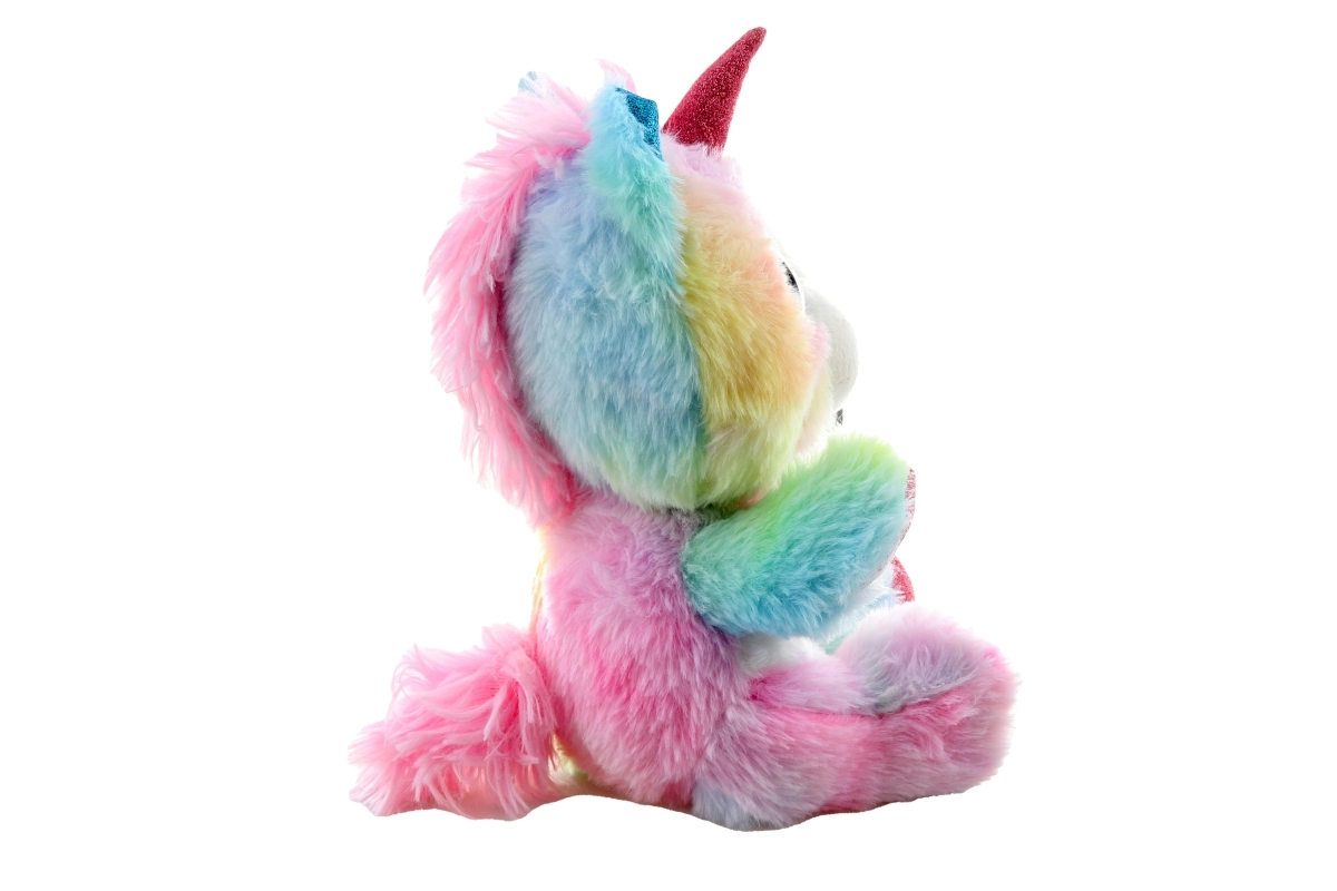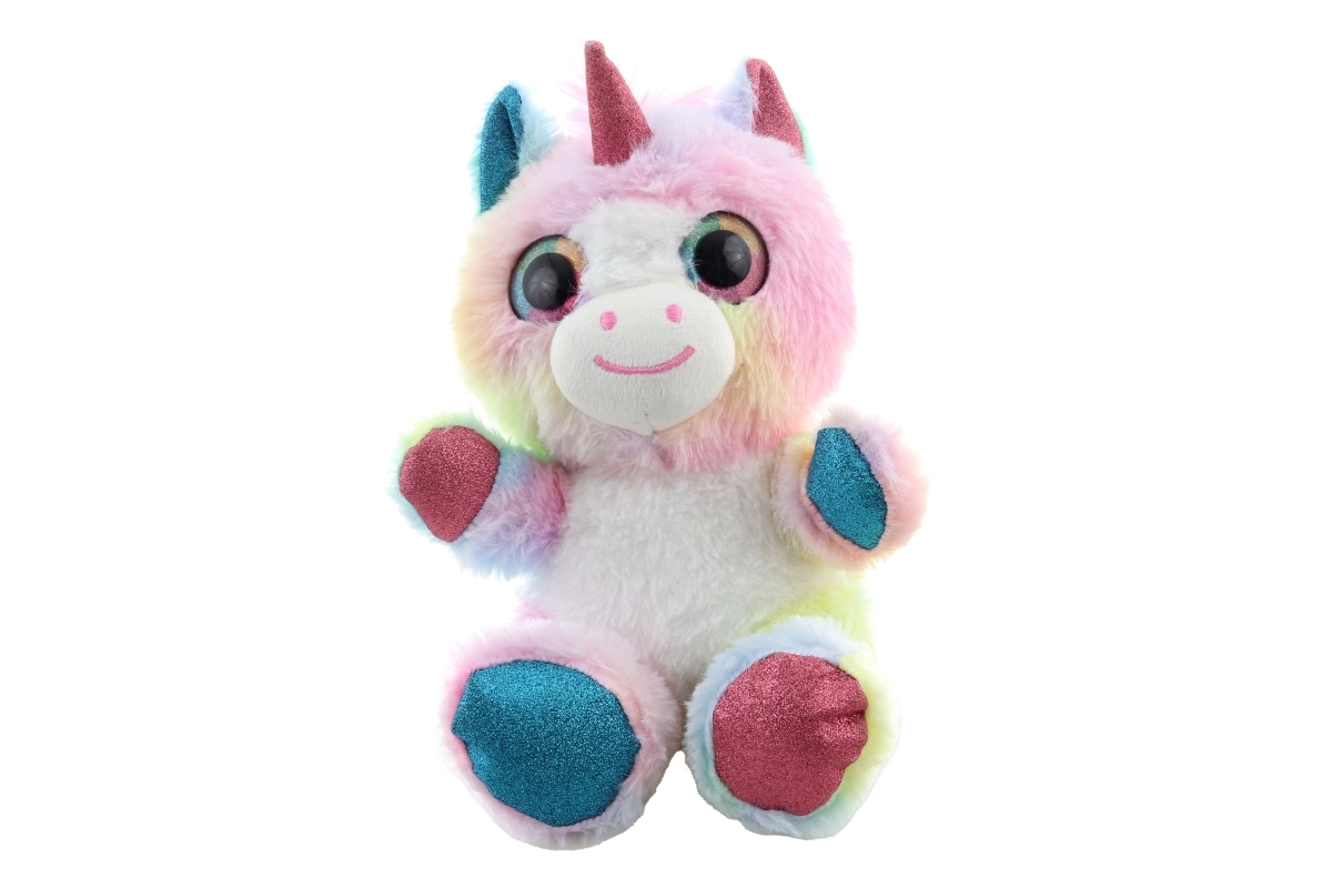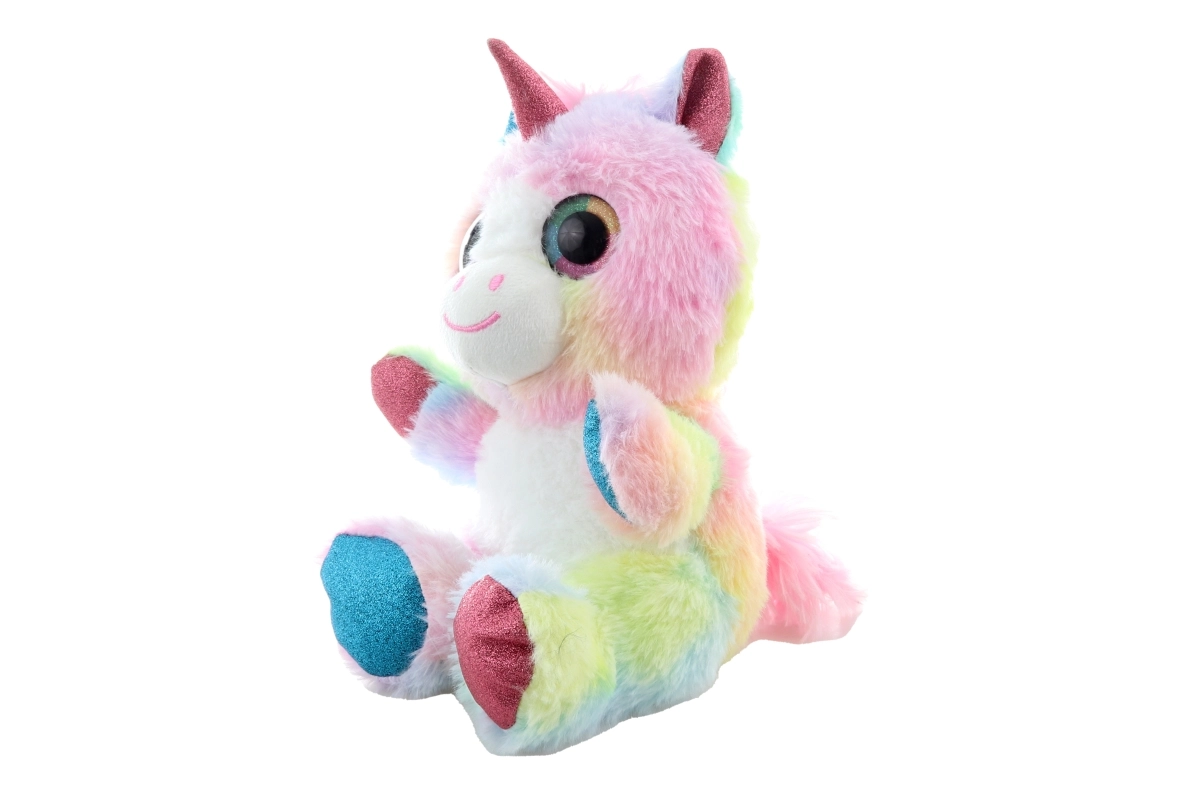 Deze kleurrijke pluchen eenhoorn verovert kinderharten met zijn zachte oppervlak en magische uitstraling. Pastelkleurige regenboogtinten, glinsterende details op de hoorn, oren en hoefjes en grote geborduurde oogjes maken hem tot een geweldige vriend voor spel en om bij in slaap te vallen.