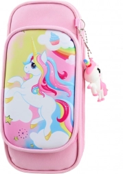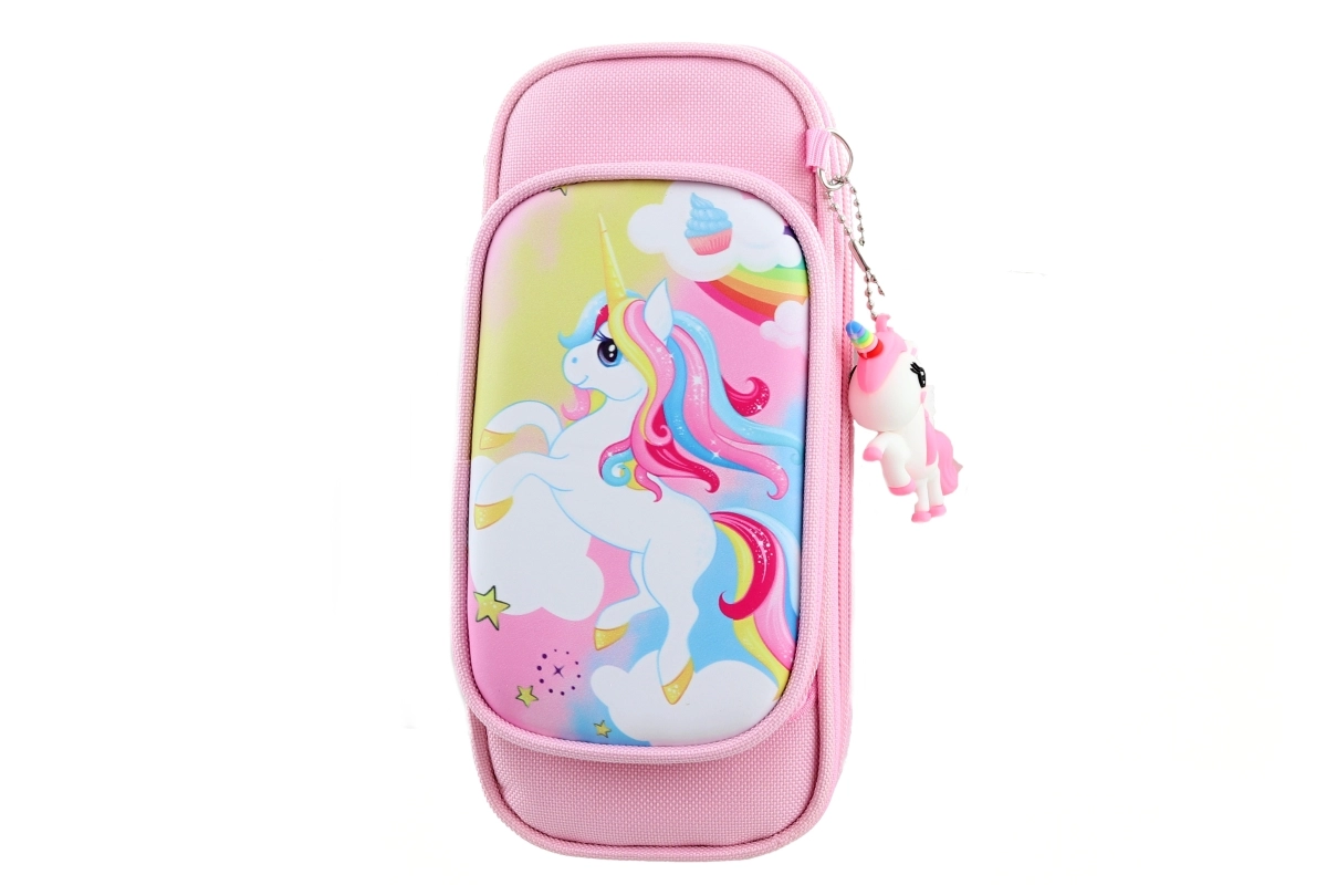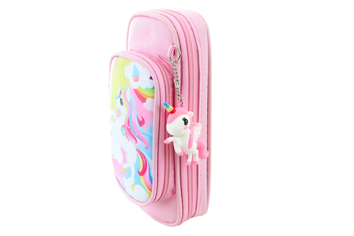 Schattig roze etui met eenhoorn-motief dat elke schoolgaande leerling zal verrassen. Het biedt twee vakken met rits voor overzichtelijke opslag van schrijfwaren en kleinigheden, en is versierd met een eenhoornhanger en een kleurrijke print. De zachte textiele uitvoering en het compacte formaat zorgen voor comfortabel meenemen, ook in een kleinere rugzak.