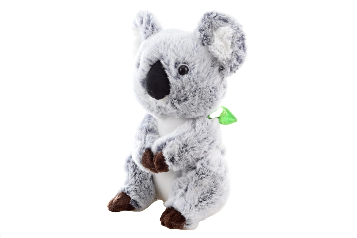 Het kenmerkende zwarte neusje, zachte oortjes en het contrasterende buikje zien er levensecht en charmant uit, net als een echte koala.