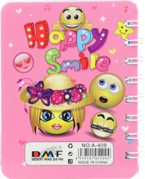 Stijlvol notitieboek met smileymotief, leuk voor kinderen én volwassenen. Gekleurde gelinieerde bladen maken overzichtelijk schrijven makkelijker, terwijl de stevige spiraal comfortabel omslaan en volledig plat openklappen mogelijk maakt. Het compacte formaat past in handtas, rugzak of etui.