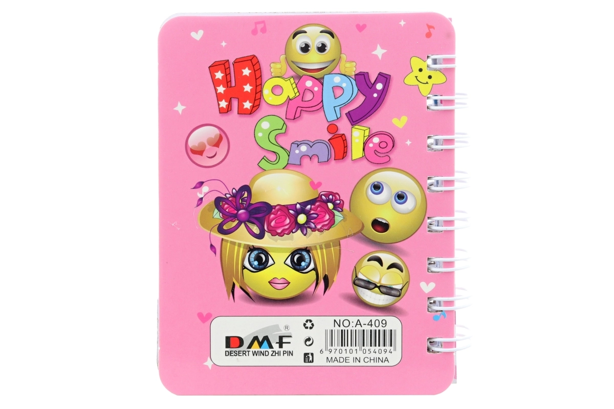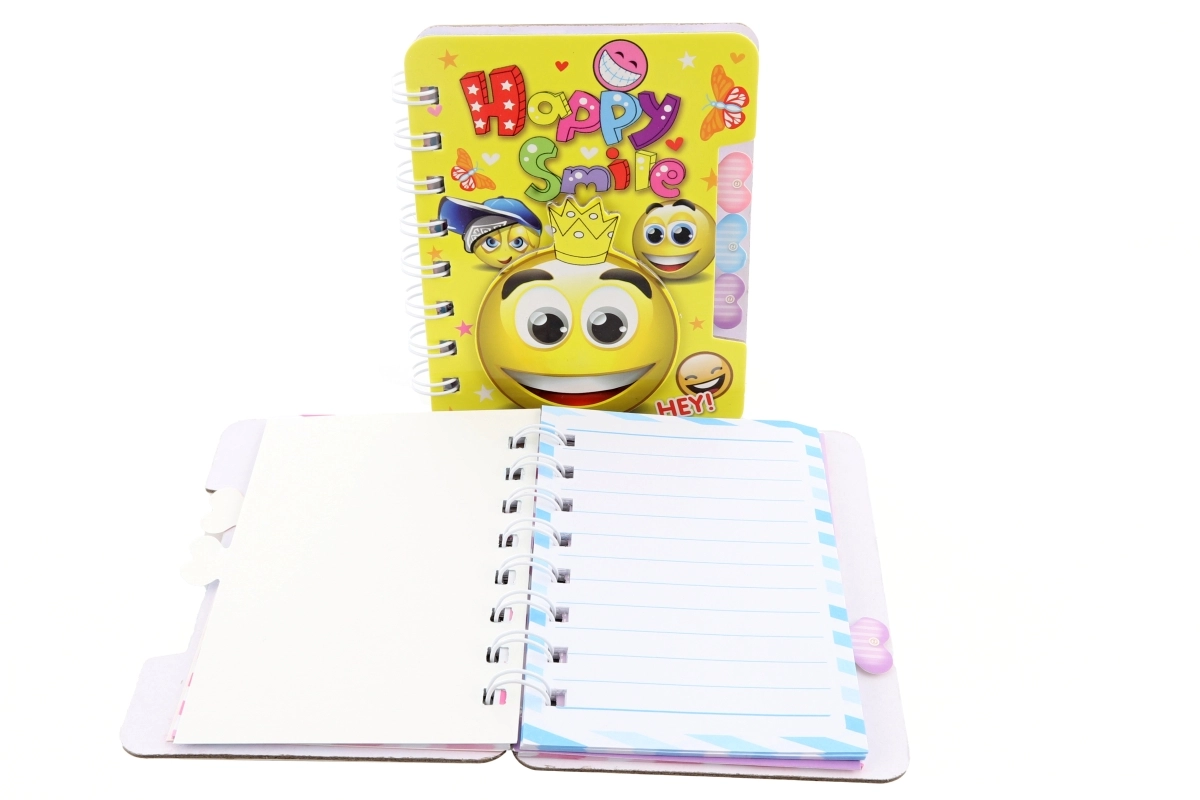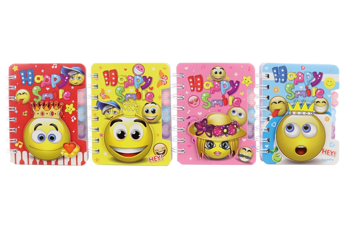 Omslagen met het opschrift “Happy Smile” zijn verkrijgbaar in meerdere vrolijke designs. Het notitieboek is verpakt in een zakje en geschikt voor notities, lijstjes, een dagboek of snelle schetsen. Dit product is geen speelgoed.