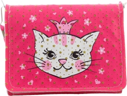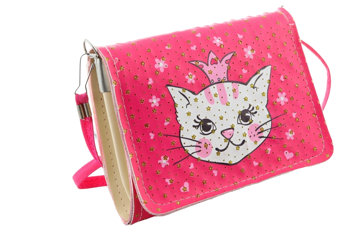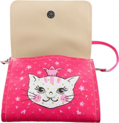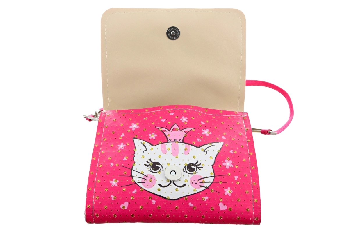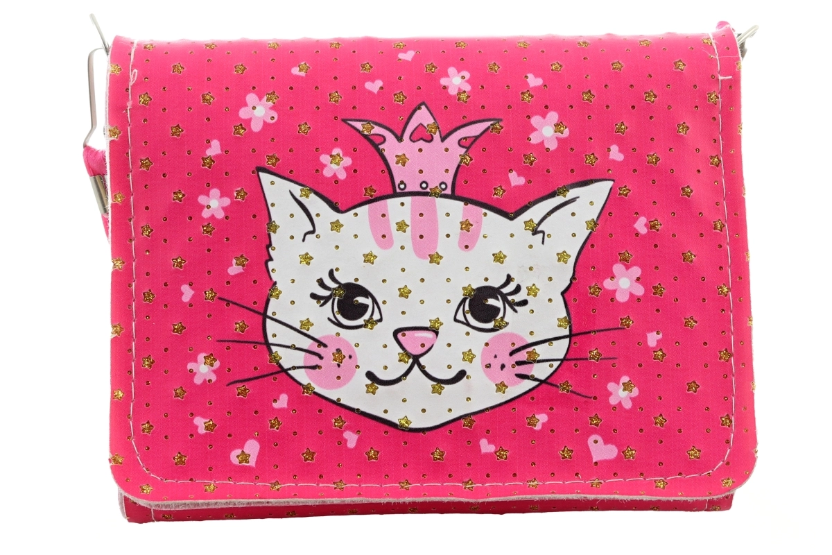 Een schattig kinder schoudertasje met een kattenmotief dat elke kleine dame zal verrukken. Het biedt een prachtig diepe kleur, 2 binnenvakjes voor kleinigheden en handige drukknoopsluiting. De compacte afmetingen van 15 × 12 × 4 cm zijn ideaal voor kinderen vanaf 3 jaar.