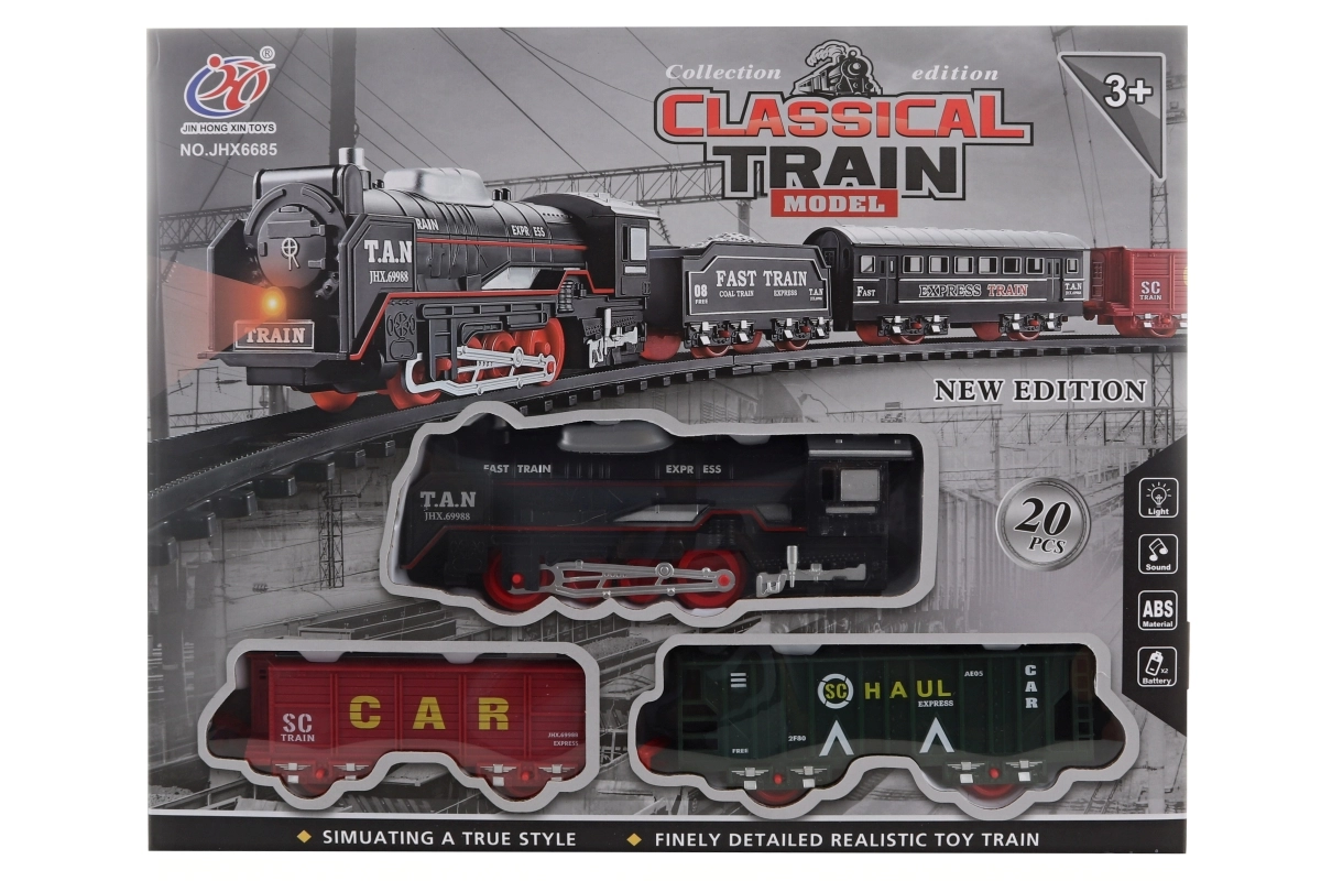 In de doos vind je alles voor direct plezier: locomotief, 2 wagons, een set rails voor een ronde baan en decoratieve stickers. De voeding wordt verzorgd door 2× AA-batterijen (niet inbegrepen). De hele set is overzichtelijk verpakt in een doos en is dankzij de compacte afmetingen gemakkelijk op te bergen.