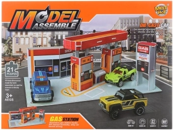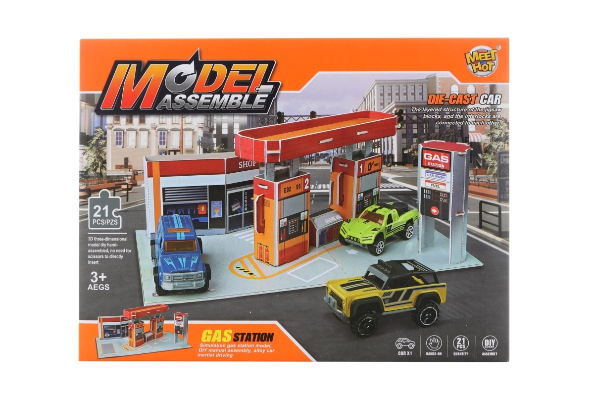 De losse onderdelen van zacht karton klikken gemakkelijk in elkaar en vormen een stabiel model van een benzinestation met praktische afmetingen om op tafel of op de vloer mee te spelen. De hele verpakking is compact en ook geschikt als een geweldig cadeau voor kleine liefhebbers van auto’s en bouwsets.