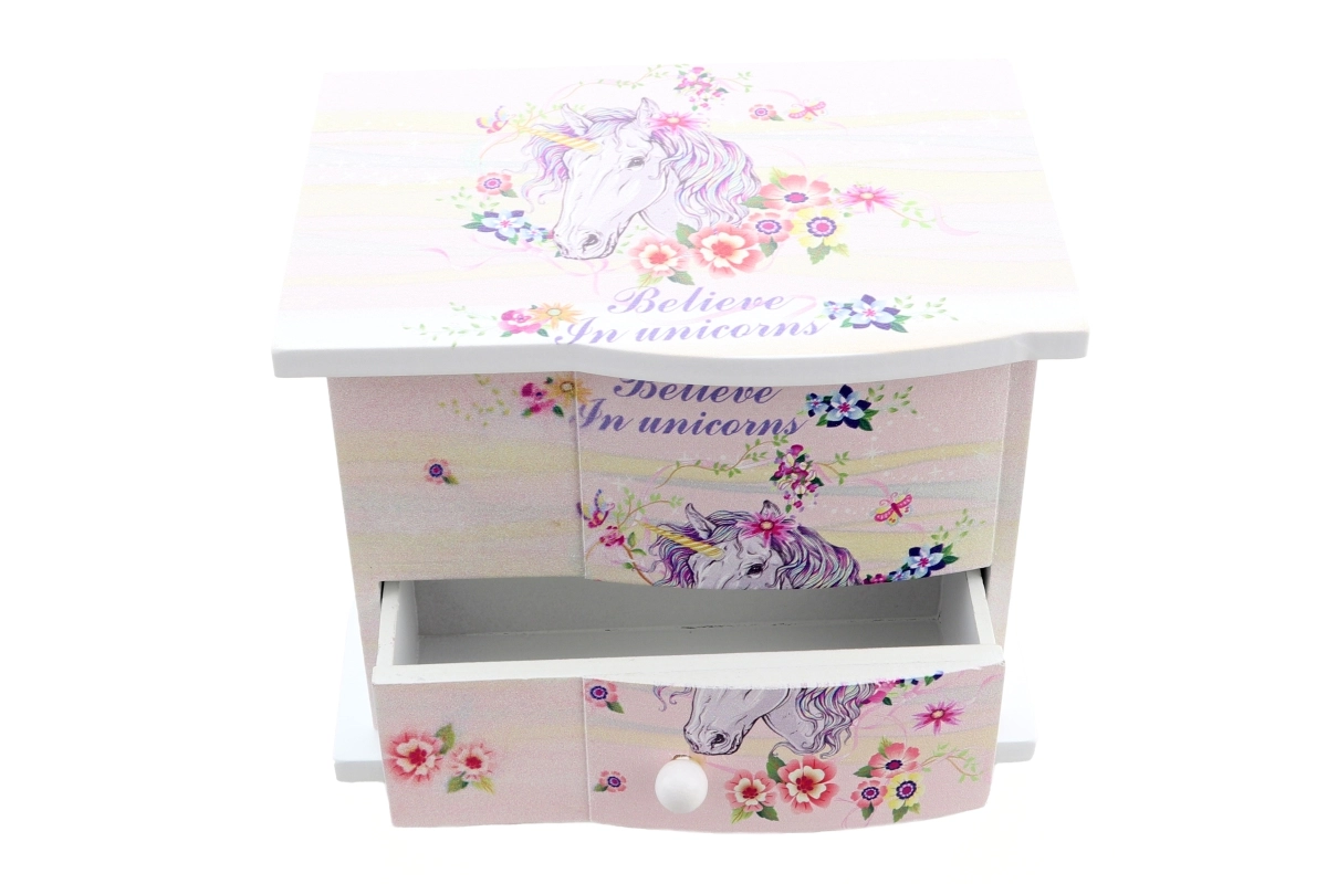Een betoverende houten juwelendoos met een eenhoornmotief die elke kleine diva zal verrukken. Bij het openen begint een hartje te draaien en klinkt een zachte melodie. Met binnenspiegel, een praktische lade voor kleine schatten en een slotje met sleuteltje. Ideaal cadeau voor kinderen vanaf 3 jaar. Muziekmechanisme, spiegel, lade voor sieraden, kinderlijk design met eenhoorn.