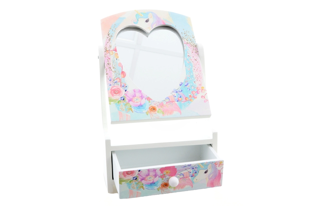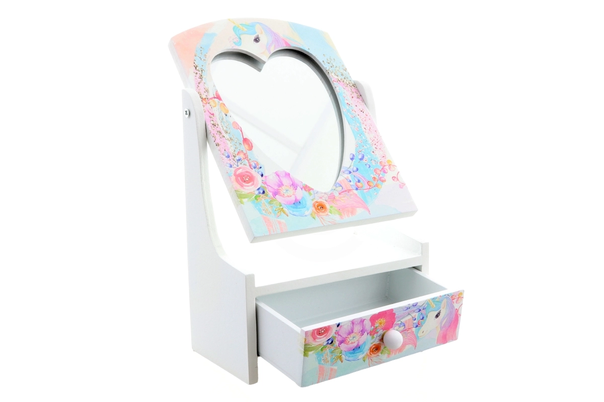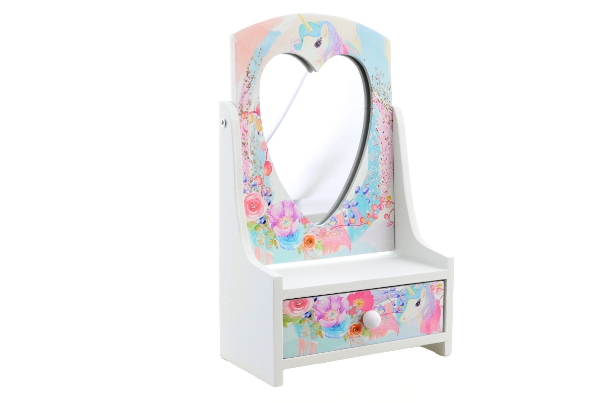 Een betoverende kindersieradendoos met een hartvormige spiegel en een eenhoornthema, ideaal voor het opbergen van kleine schatten. Biedt een praktisch ladeblokje, stabiele houten constructie en veilig gebruik vanaf 3 jaar.