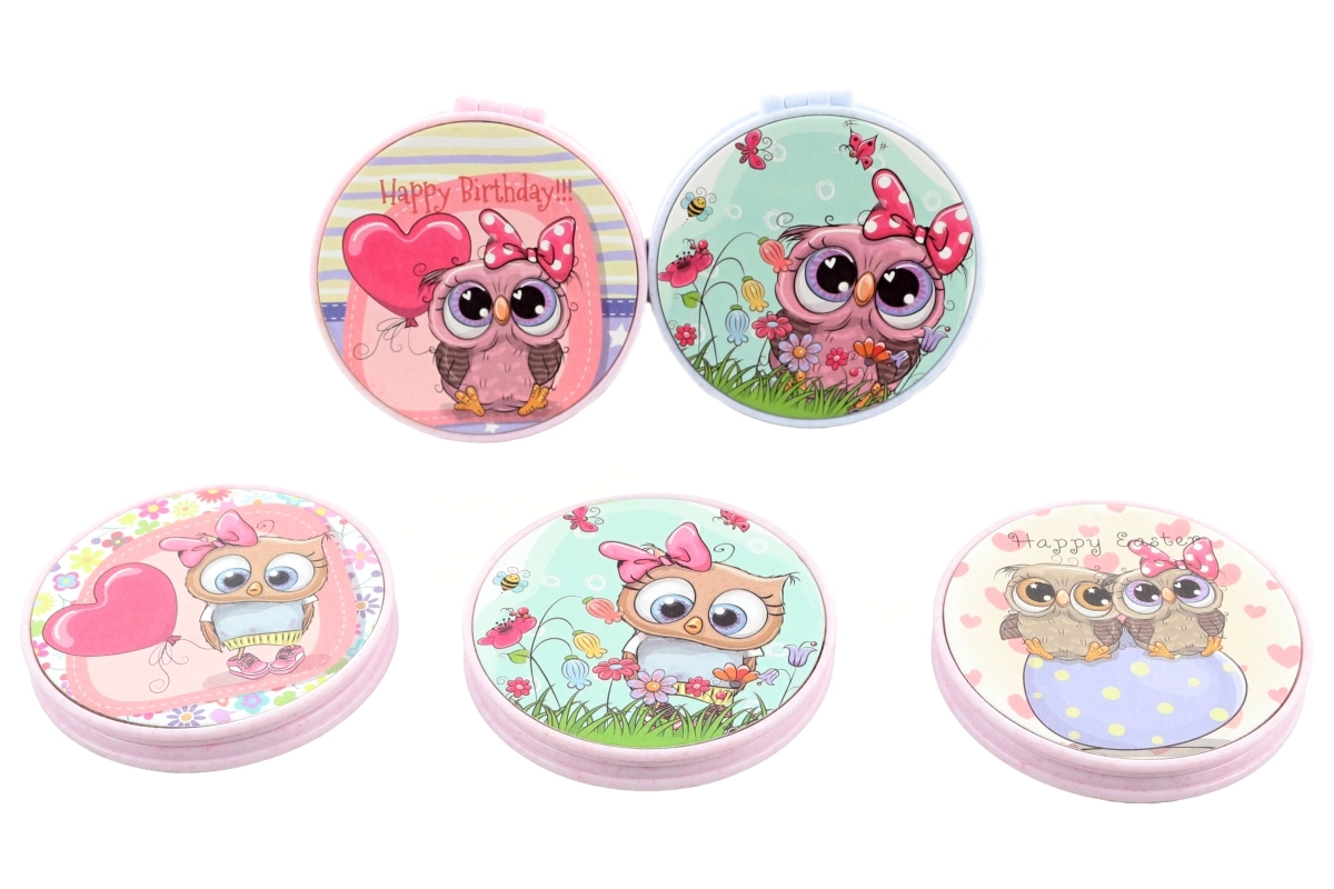 Het spiegeltje heeft een kunststof behuizing met schattige uilenprints en biedt na openen twee spiegeloppervlakken voor snelle correcties van make-up of haar. We leveren meerdere motieven afhankelijk van de actuele voorraad. Verpakt in een zakje.