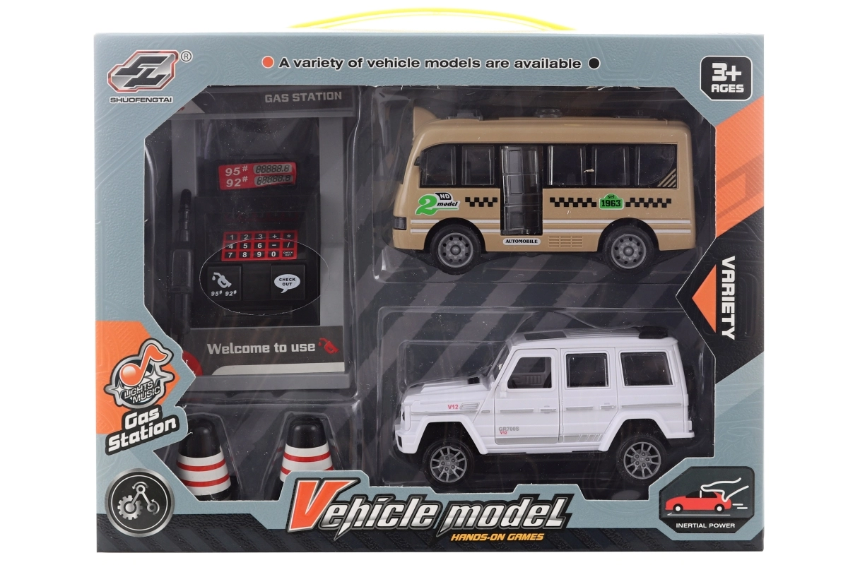 Leuke set voor kleine bestuurders met 2 frictieauto’s en een batterij-aangedreven pompstation dat tanksounds en een melodie afspeelt. Inclusief 3× AG13-batterijen, dus je kunt meteen starten. Ideaal speelgoed voor kinderen vanaf 3 jaar.