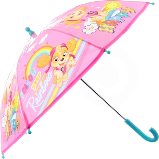 Deze stijlvolle roze paraplu met vrolijke afbeeldingen van puppy’s, regenbogen en teksten als “Be Happy” en “Follow your Rainbow” zal elke jonge fan van PAW PATROL blij maken. Dankzij de koepelvorm biedt hij betrouwbare bescherming tegen regen en ziet hij er tegelijk geweldig uit.