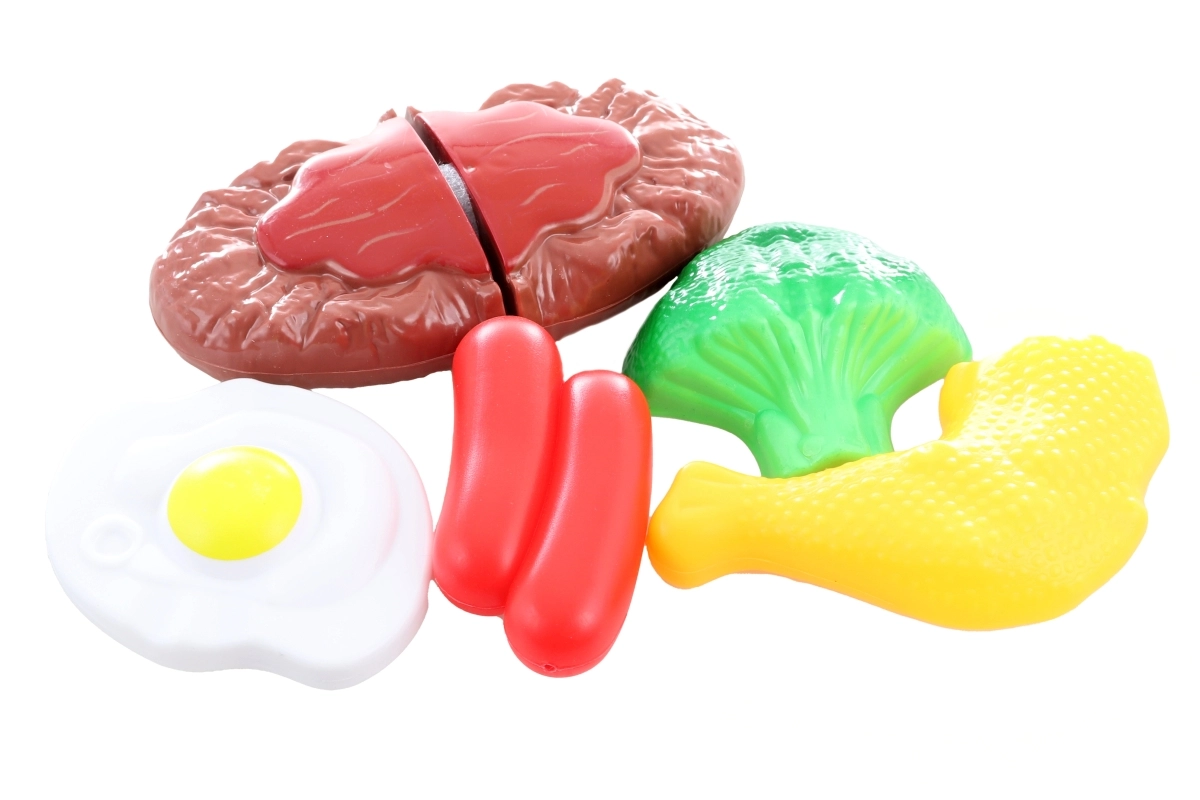 Eieren, steak, worstjes, kippenpoot, vis en groenten in levendige kleuren prikkelen de fantasie en leren kinderen voedingsmiddelen herkennen.